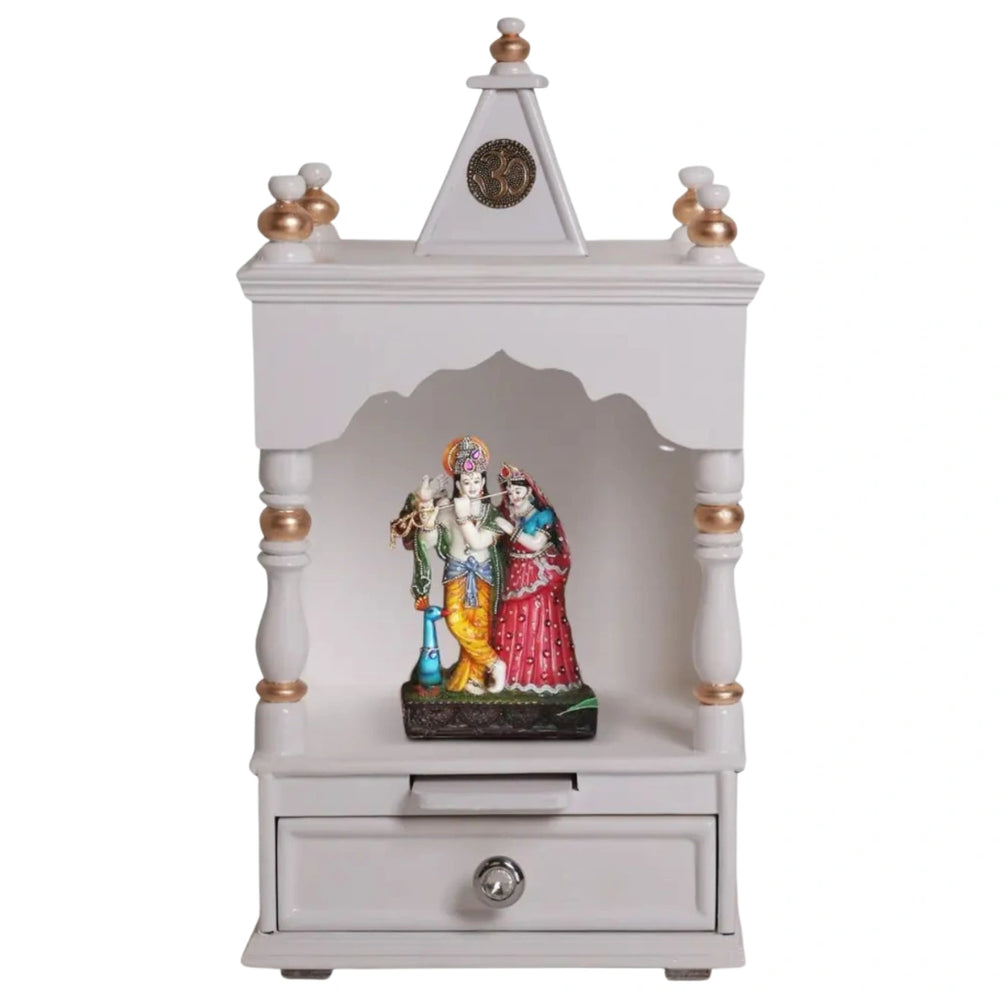 Functional- The pillars are strong and provide the support needed to hold the deities with ease. Despite being small and a wall mandir design, this small mandir has a drawer to store pooja supplies that you will need during your prayers. You can store incense sticks, diyas, prayer beads or other pooja items close to you so that you can have undisturbed prayers to the Gods. The knob on the drawer is designed to give off a crystal-like finish that adds a sophisticated touch to the wall mandir design. This small mandir for home also comes with a detachable tray to hold your incense sticks and diya. This tray is very useful as it prevents crowding the seating area for the deities. This helps you concentrate on your prayers while being able to burn incense and perform your pooja.