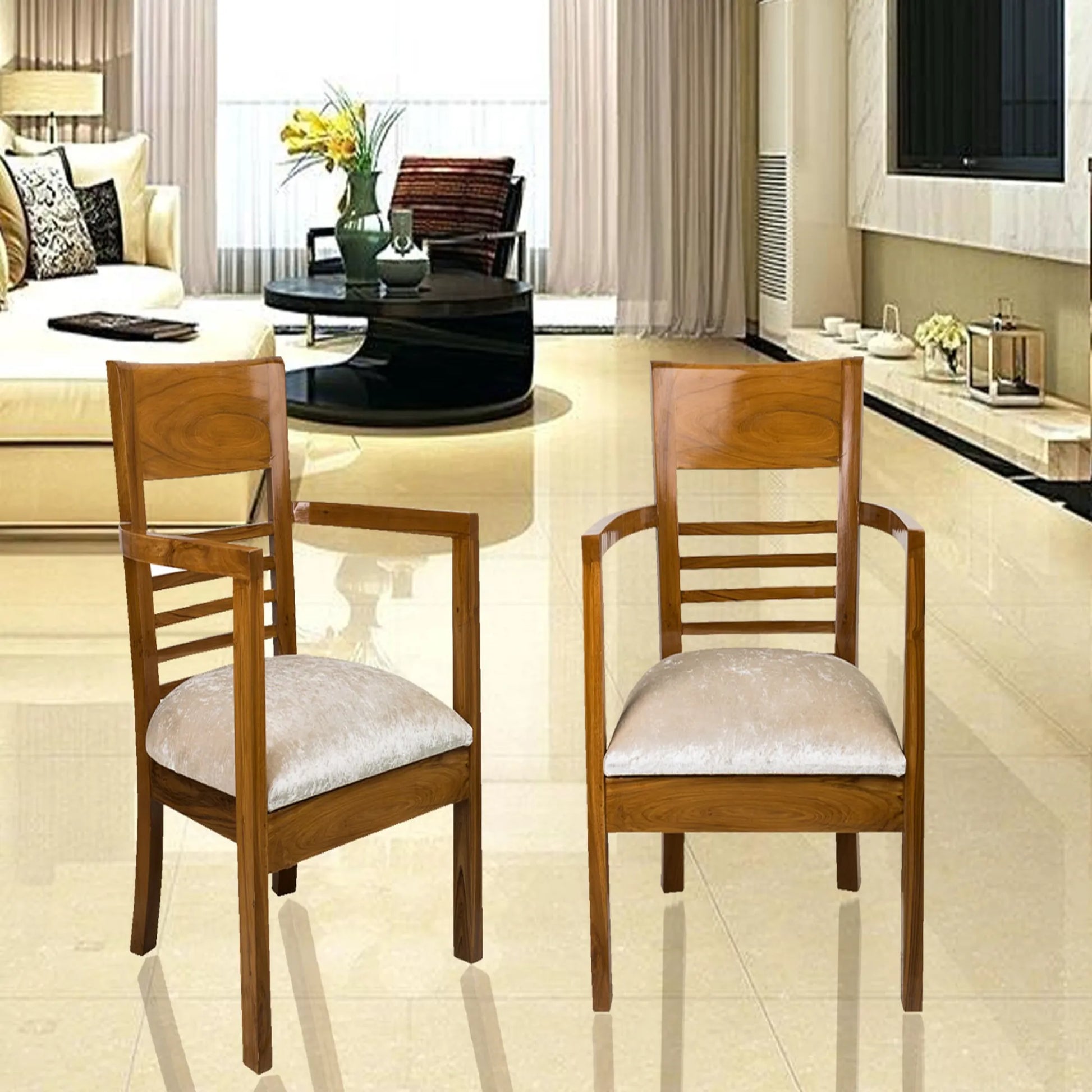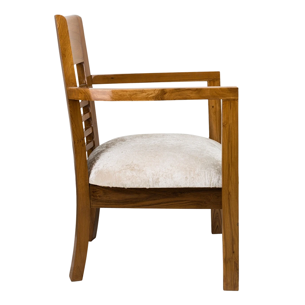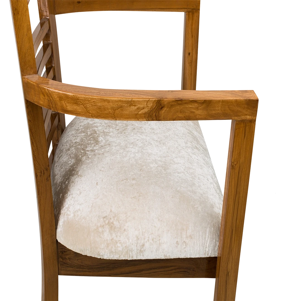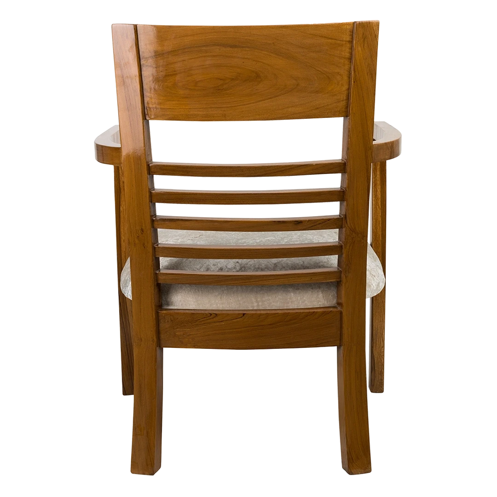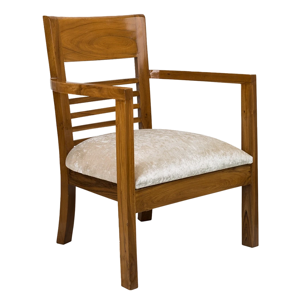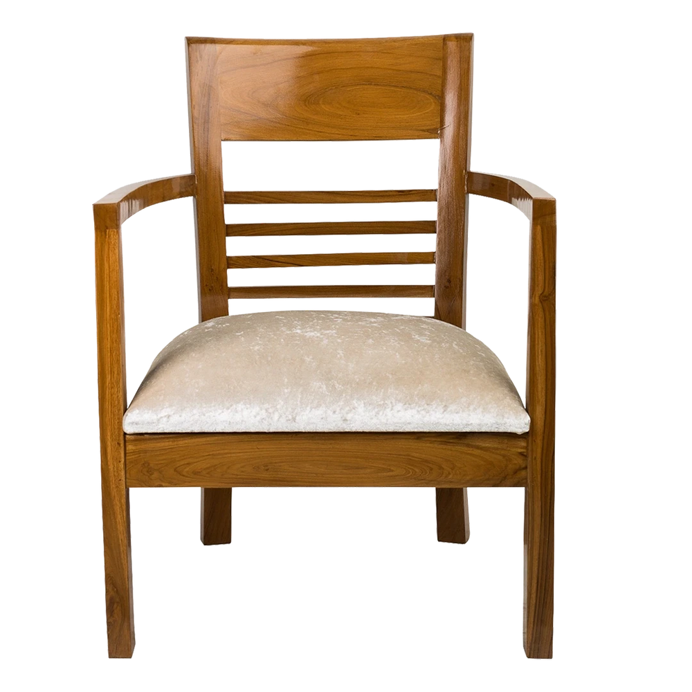 The Spring Wooden Arm Chair set brings classic design and comfortable seating to your bedroom or living room. To make you comfortable and relaxed, this chair has a backrest with a slat that keeps you cool and gives you good support. This chair comes with a wide and cushioned seat so that you have a comfortable space to sit. The smooth armrests and thick, cushioned seats with soft beige fabric provide good comfort and support. The natural teak color of the wooden frame shows the natural wood lines and gives a warm look that matches many styles. A small space near the top of the backrest lets air flow and keeps you refreshed. This chair has a unique and flat side profile. The glossy natural teak finish on this teak wood chair will bring your living room to life. The smooth surface and fine finish make it easy to clean with just a soft wipe.