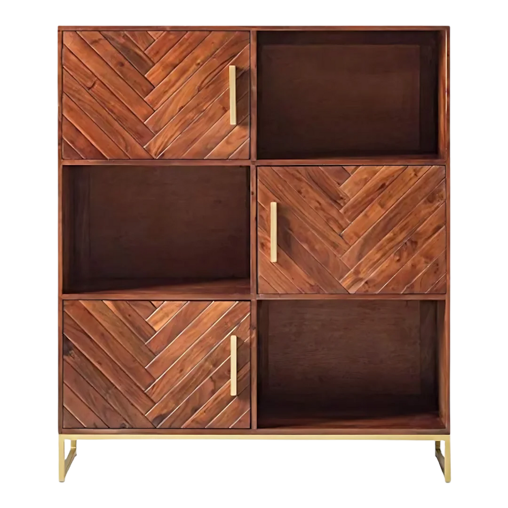 Geometric design, Modern bookshelf, Wooden finish, Multiple shelves, Vertical structure