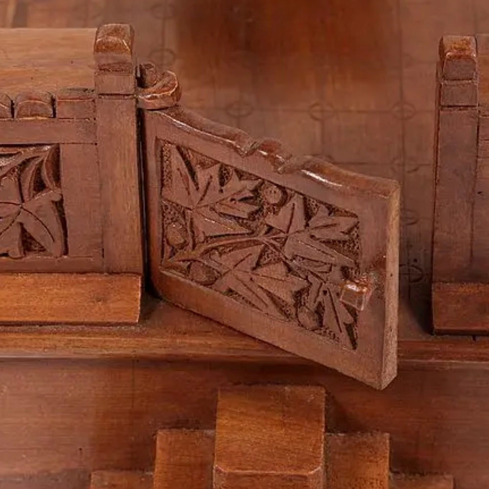 The carved jaali panels on the sides of the mandir show the skill and beauty of traditional Indian woodwork. Each floral design is made with care to let light and air pass through easily while giving a beautiful background for the idols. These panels make the mandir look open and bright and add a peaceful feel to the pooja space. The even patterns on the jaali show fine work and give the temple a neat and balanced look. The teak color is smooth and has bought out the finer details of every curve and line. These are those panels which introduce the beauties and peace to the mandir. The design makes the temple rich and holy and makes it look timeless and graceful to adorn any house.