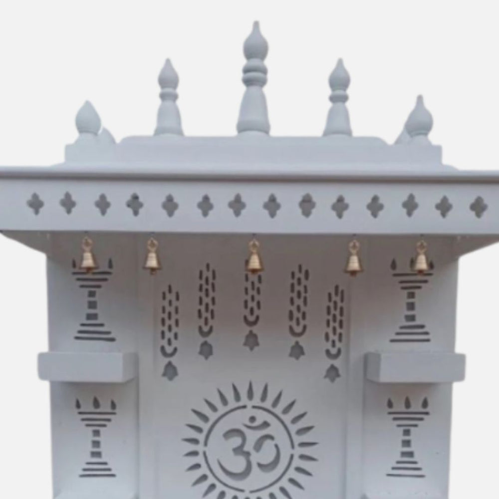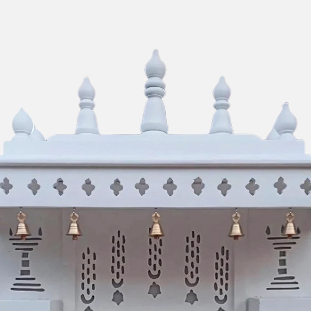 The best part of this teakwood pooja mandap is the backdrop which has an intricately carved Om symbol and a radiant pattern. This architectural structure establishes a supernatural central point which immediately increases the holiness of the temple. The cutwork makes the design distinct as well as gives it depth and character. It represents good energy, peace and protection and therefore one important element in the mandir. The white color finish enables the Om motif to bring in purity and calmness. The backdrop design is a reflection of devotion and calm because it serves as the spiritual heart of the temple. This makes the mandap a perfect big mandir for home.