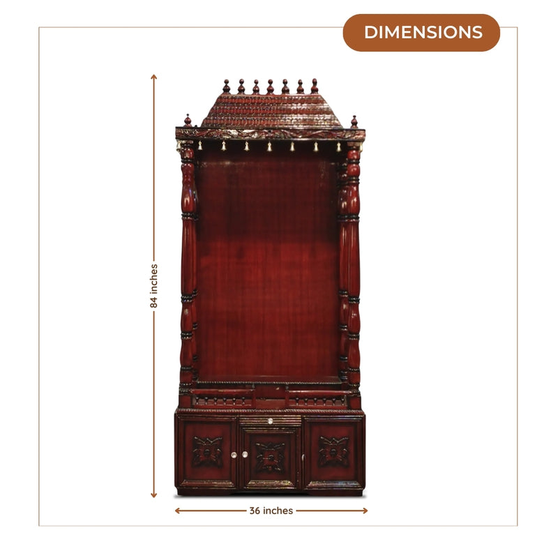 This Sudarshan Teak Wood Mandap in brown color has a tall and majestic look that makes it stand out as a big pooja mandir for home. The glossy brown color makes the surface have a smooth and rich touch. The top of the temple is a grand design with a lot of carvings that appear classy in all angles. The small bells below the top panel add a graceful charm to the structure. The four powerful pillars make the mandap balanced and firmly hold the top. This large wooden temple has the base section with three drawers that assists in keeping the pooja essentials secure. The carvings on the drawers also make it look royal and add depth to the design. This is a large temple and allows one to store multiple idols and pooja plates there. The entire design introduces something traditional to the pooja room and suits both the plain and ornate interiors. The glossy finish is used to make it shine even more and complete the classy appearance. The design looks uniform from every angle which makes it a centerpiece in the room. The strong build ensures the pooja mandap stays stable and long-lasting.