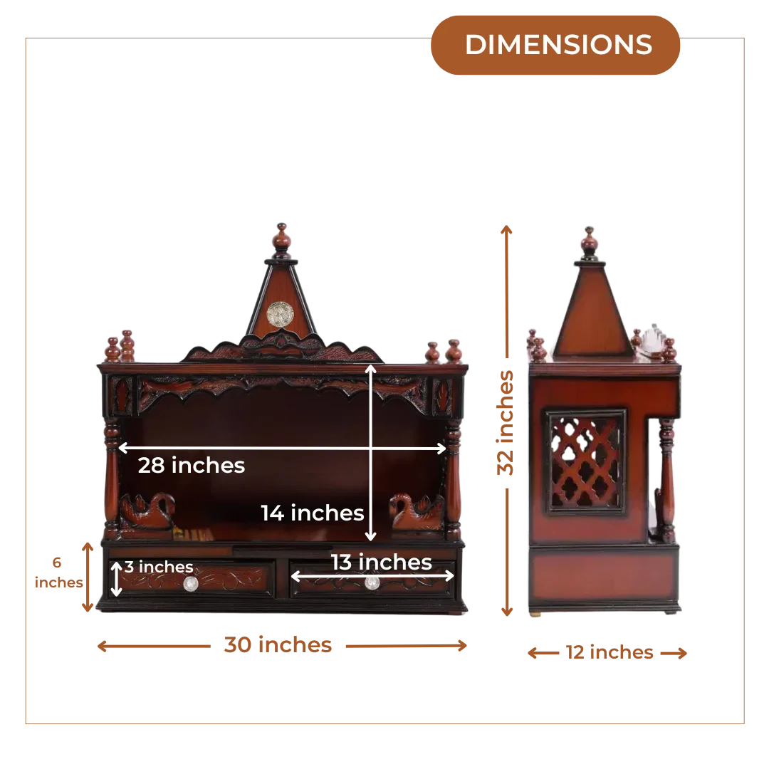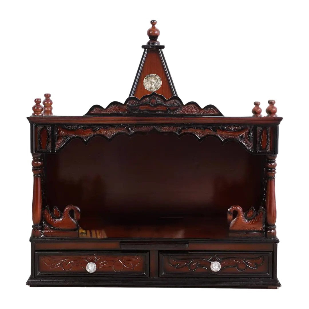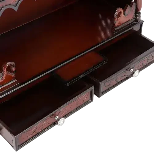 The Sukhatman Wooden Temple features elegant carvings in the shape of swans at its base bringing an artistic flair to your spiritual place. These swan accents are carefully designed and placed to enhance the temple's overall look representing purity and elegance. The intricate details of the swan motifs showcase traditional craftsmanship that adds to the temple's visual charm. These decorative touches not only serve as eye-catching centrepieces but also infuse your worship space with a sense of serenity and balance making your pooja area even more sacred.