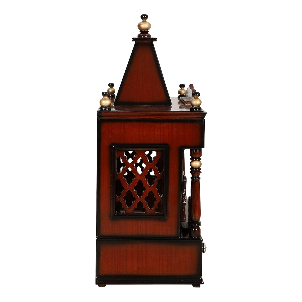 Elevate your everyday rituals with the Sukhatman Medium Wooden Temple, a piece that beautifully blends aesthetics and functionality to create a sacred ambiance in your home. The elegant brown color with gold accents adds a touch of luxury and refinement to your spiritual space. Crafted from high-quality teak wood, this medium-sized wooden temple brings both visual appeal and sacredness to your home. The intricate carvings on the front panels and pillars give the temple an artistic flair that makes the space both visually pleasing and holy. With ample room for your deities and a practical two-drawer storage system, this wooden temple for home combines style and convenience. The lattice side panels filter soft light, adding to the serene and clean environment. This home temple is designed to match beautifully with your home décor. The temple's strong structure will make it last for many years, so it can be passed on to future generations. The beautiful details will add a sense of peace and holiness to your home.