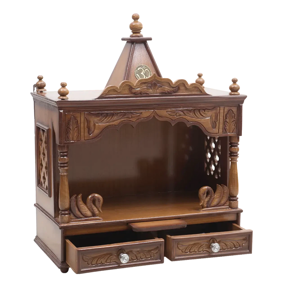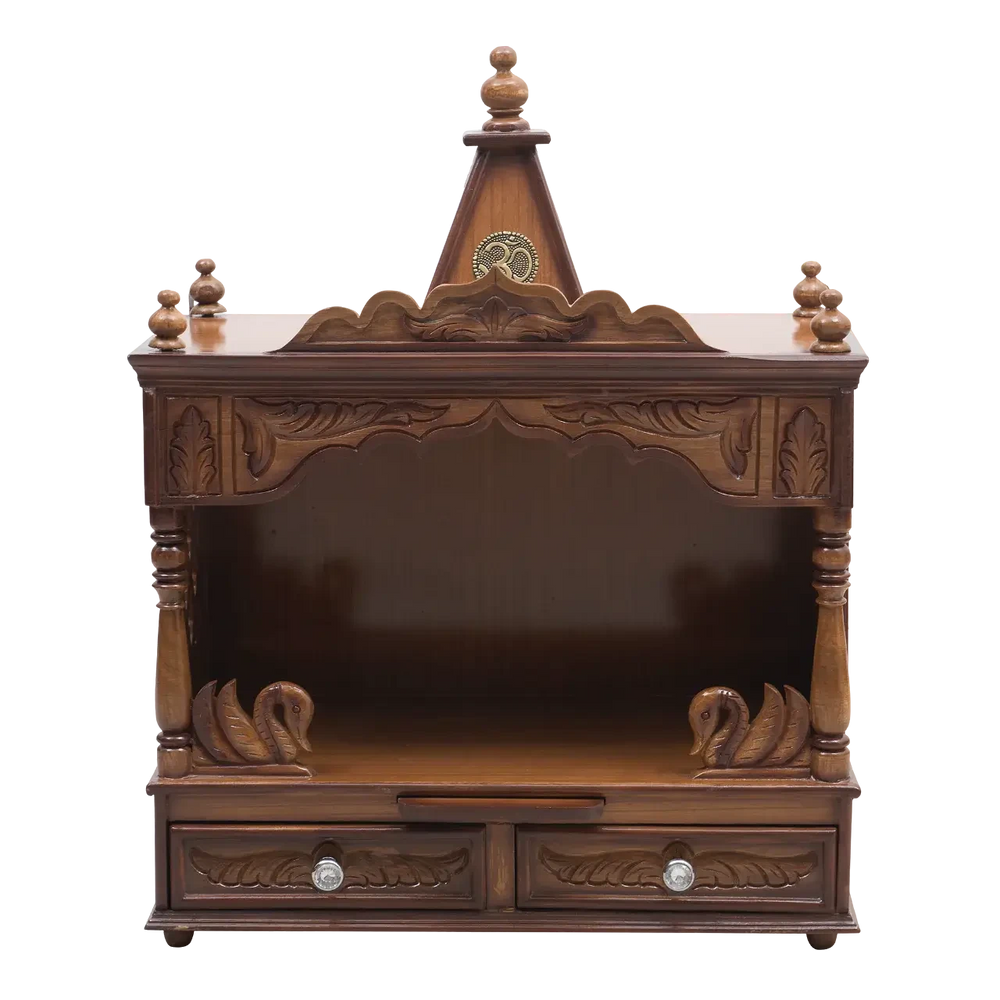 The Sukhatman Wooden Temple features elegant carvings in the shape of swans at its base bringing an artistic flair to your spiritual place. These swan accents are carefully designed and placed to enhance the temple's overall look representing purity and elegance. The intricate details of the swan motifs showcase traditional craftsmanship that adds to the temple's visual charm. These decorative touches not only serve as eye-catching centrepieces but also infuse your worship space with a sense of serenity and balance making your pooja area even more sacred.