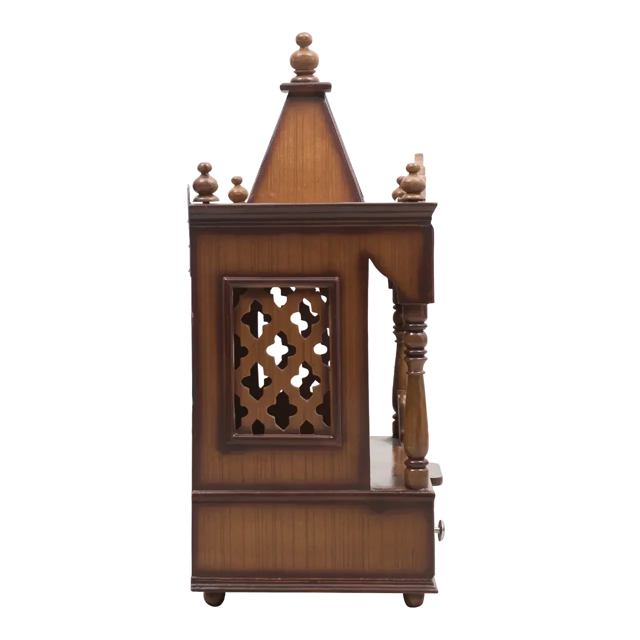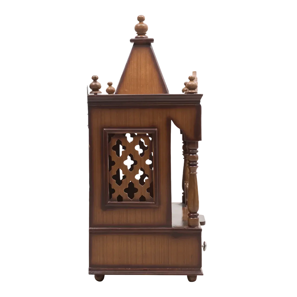 The Sukhatman Wooden Temple made of wood showcases side panels with a lattice pattern that brings a unique touch to its design. These panels allow light to filter through, casting beautiful shadows in your prayer space. The lattice work adds a touch to the temple while also elevating its visual appeal. These side panels serve purposes by allowing air circulation and natural light to enter the wooden temple. This carefully considered design element creates an atmosphere of sacred setting making the temple both a stunning and practical addition to your home.