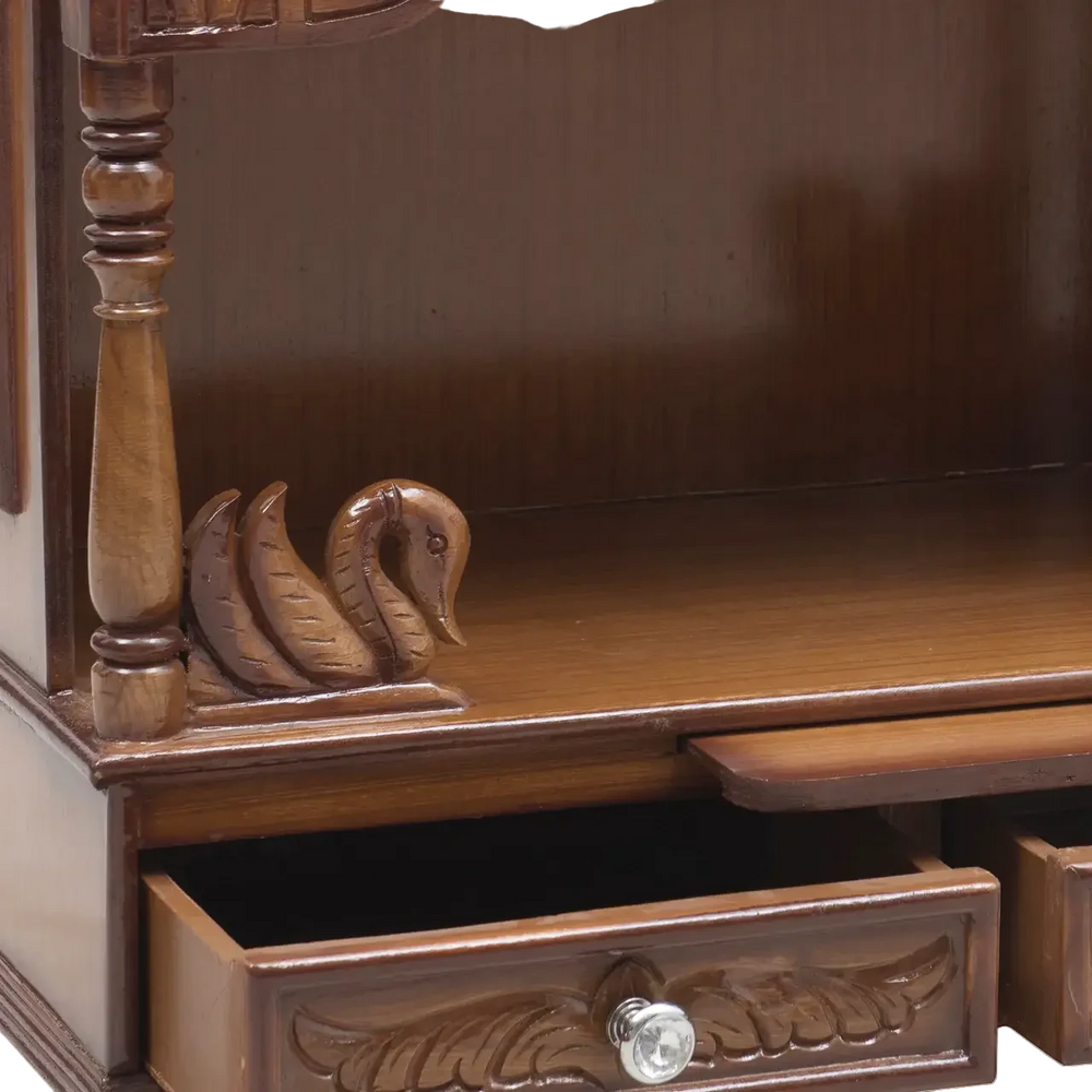 The SukhatMan wall mounted mandir truly stands out for its spiritual value and close attention to detail. It is a wonderful combination of practicality and grace. The intricate design of the wall mandir in natural teak color offers a beautiful mood making the space a spiritual and peaceful place. The wall mandir feature is perfect for transforming a small space into a small temple for home. It is not only beautiful but the addition of a storage drawer to keep the pooja items that make this mandir design in wall in teak color both practical and functional, making it a spiritual attraction rather than a mere piece of furniture.