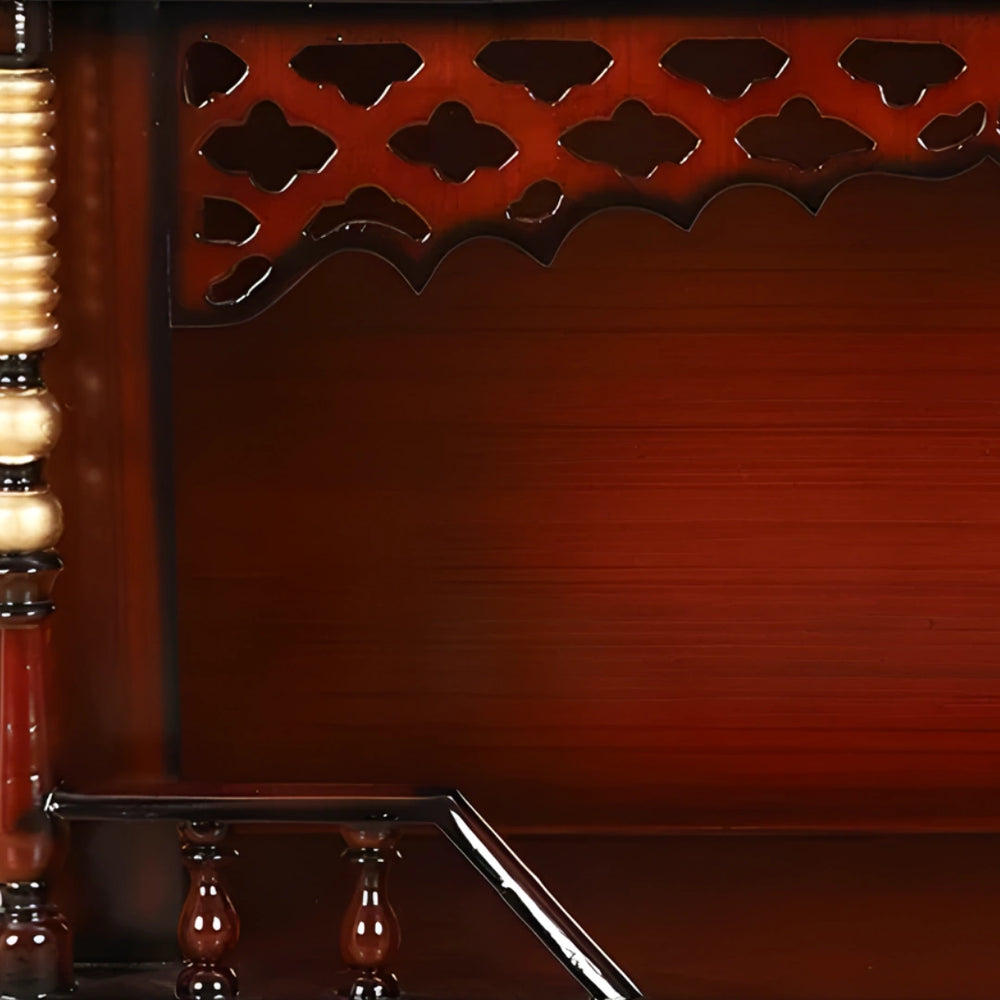 This Pooja mandir has been designed with lots of available storage solutions that help keep your pooja area in order. It comes with two big drawers which are very suitable for keeping all pooja items essential. A dhoop tray is also centrally positioned making it easy to clean up when the rituals end. There are drawers and other practical features, such as partitions, that offer practical storage and preserve a calm environment for God-worship. The drawers help you to organize your pooja material properly. This wooden temple combines elegance and utility in equal measure. It is both beautiful and practical.
