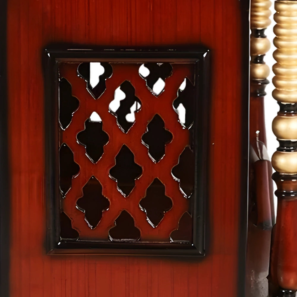 This beautiful wooden pooja mandir is handcrafted by skilled artisans that bring a touch of spirituality and a traditional look to your house. The pooja mandir has finely designed intricate jali patterns design in the front and the sides that give this home temple a timeless look. The aesthetic wooden railing at the front of the temple embraces the overall appearance of this wooden temple. this home temple is a combination of beauty and functionality, made from 100% teak. This temple is a masterpiece of artistic craftsmanship that brings a spiritual and traditional essence to your home.