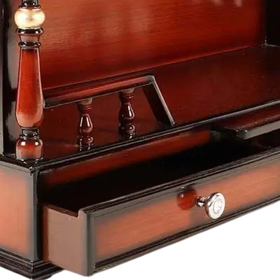 This Pooja mandir has been designed with lots of available storage solutions that help keep your pooja area in order. It comes with two big drawers which are very suitable for keeping all pooja items essential. A dhoop tray is also centrally positioned making it easy to clean up when the rituals end. There are drawers and other practical features, such as partitions, that offer practical storage and preserve a calm environment for God-worship. The drawers help you to organize your pooja material properly. This wooden temple combines elegance and utility in equal measure. It is both beautiful and practical.