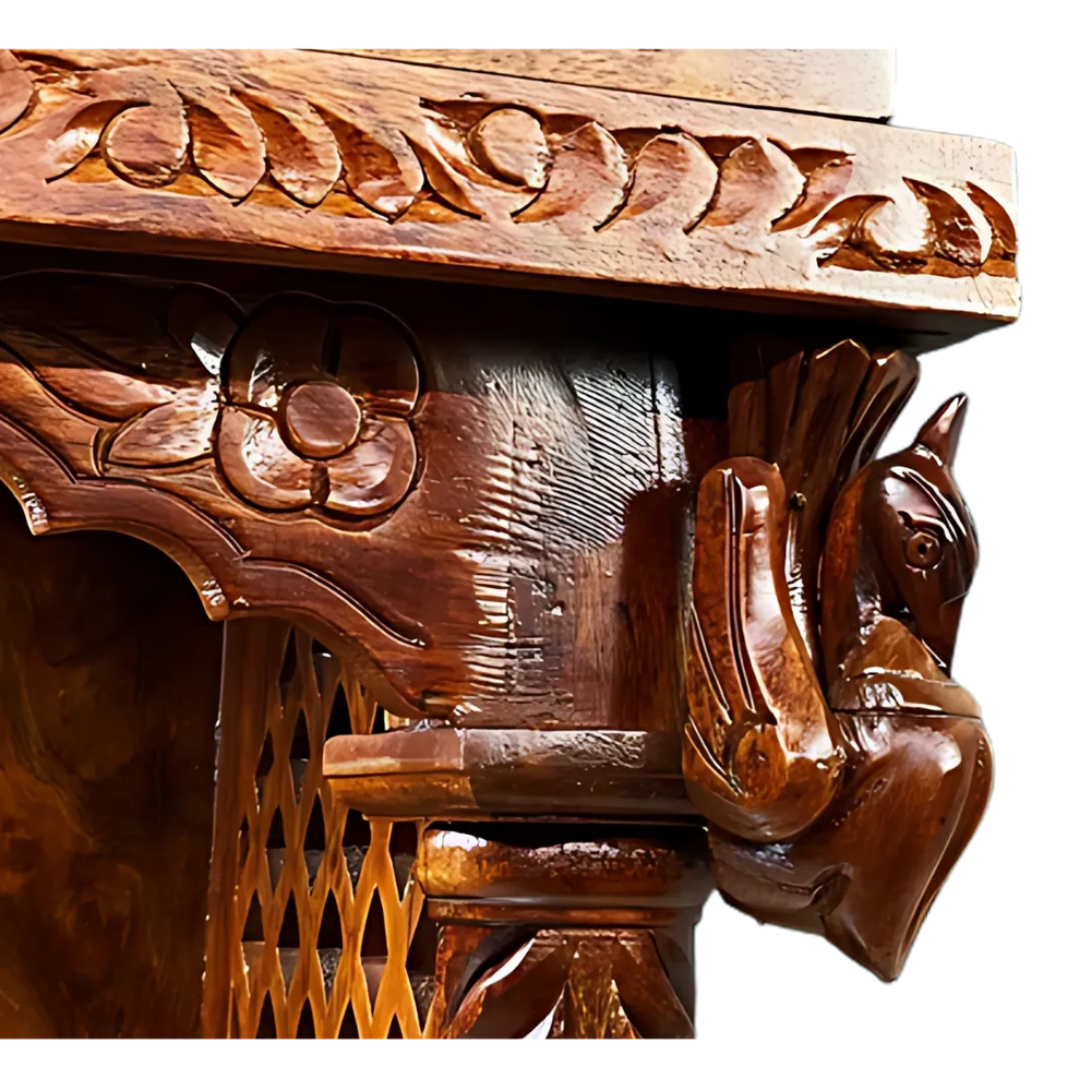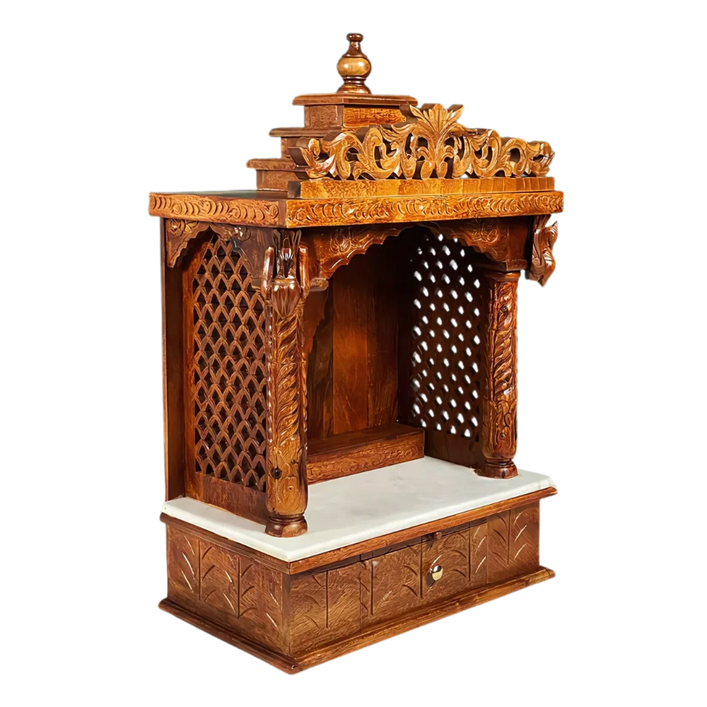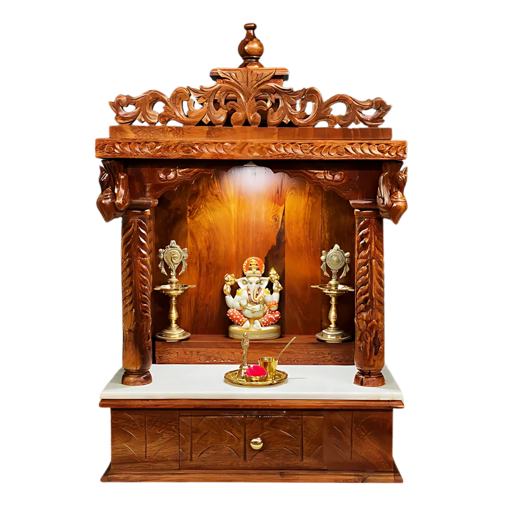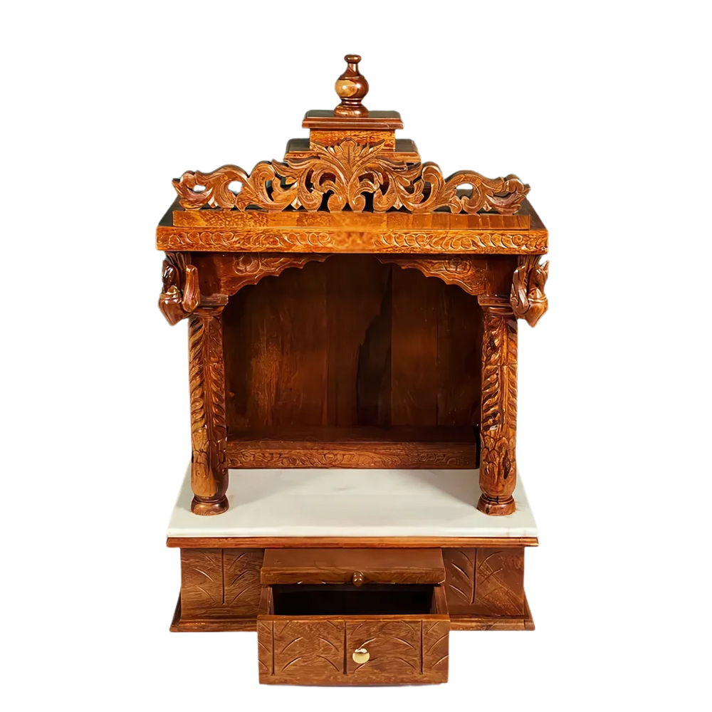 This temple has beautiful floral carvings on the front panel, pillars, and bottom drawer. These designs make the mandir look more elegant and special. The carvings follow traditional Indian temple style, so the mandir is both useful and beautiful. Each design shows devotion and tradition. Even with daily use, the carvings stay clear and sharp. These patterns help create a peaceful space for prayer. The carvings also give the mandir a rich and detailed look. They bring out the traditional feel of this teak wood mandir. The design reminds us of Indian culture. This home temple is made with both purpose and tradition in mind.