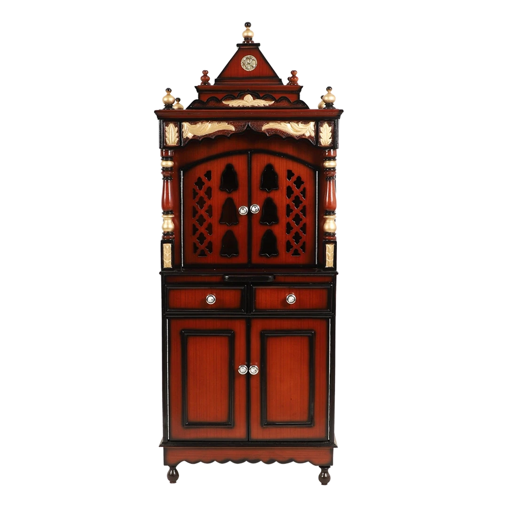 The 100% hand-carved design of the 6 feet pooja mandir resembles the true love and devotion of the artisans as well. The magnificent elegance combined with the unique tranquillity of the big mandir design in brown color blends traditional design aspects of various temples with modernity without compromising the true essence and functionality of the large pooja mandir for home online.
