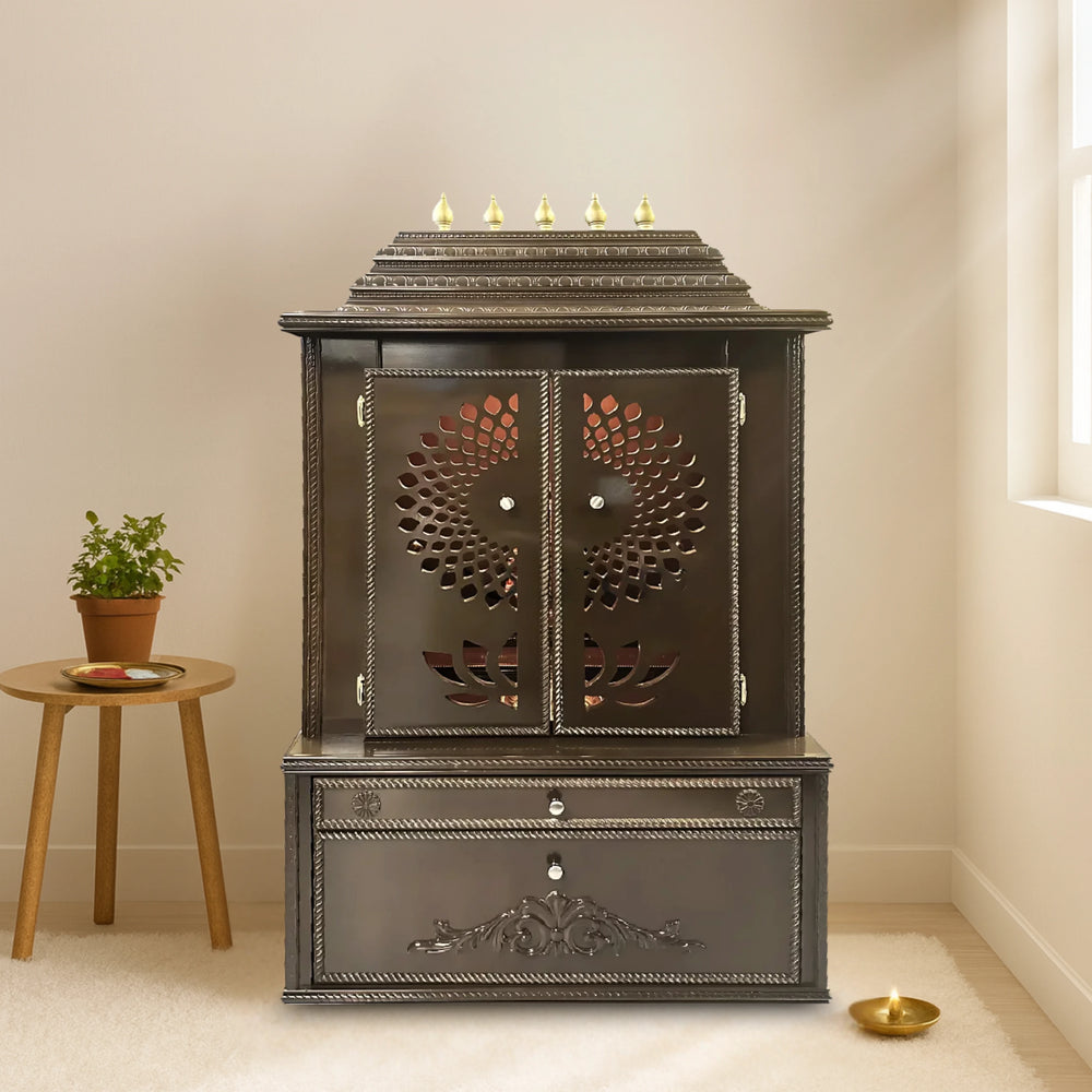 Bring divine elegance to your home with the Swarnika Teak Wood Mandap, a beautifully designed pooja manda that merges art and devotion. The front doors feature eye-catching floral cutwork that filters light and adds a decorative view even when closed. When opened, the temple exposes a high and open sanctum that has a backdrop which sets idols put inside into focus. It can be used as a large mandir in the house because of its large appearance, and its high facing looks interesting in any pooja corner. This gopuram is made in dome-style with tiered steps characteristic of the classical temple and has golden kalash details to make it look lavish. The lower storage section is provided with a wide drawer having rope patterns in border style and carved floral patterns also incorporated into the overall style. It is well balanced and clearly the layout makes each side clean and symmetrical. The teakwood pooja mandap with its choco brown finish, rich color and elaborate design, will serve as both a practical and an aesthetic feature in your home. A perfect piece for those who seek beauty, durability, and tradition in one design.