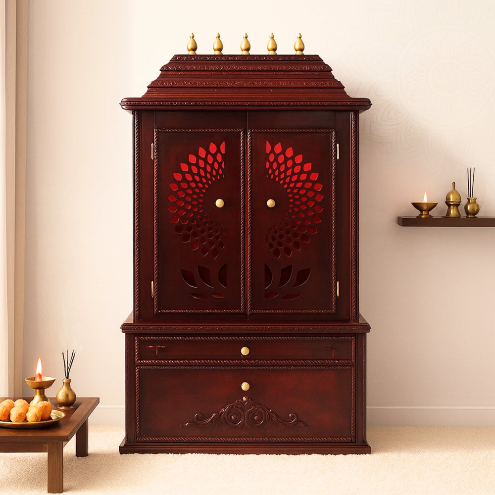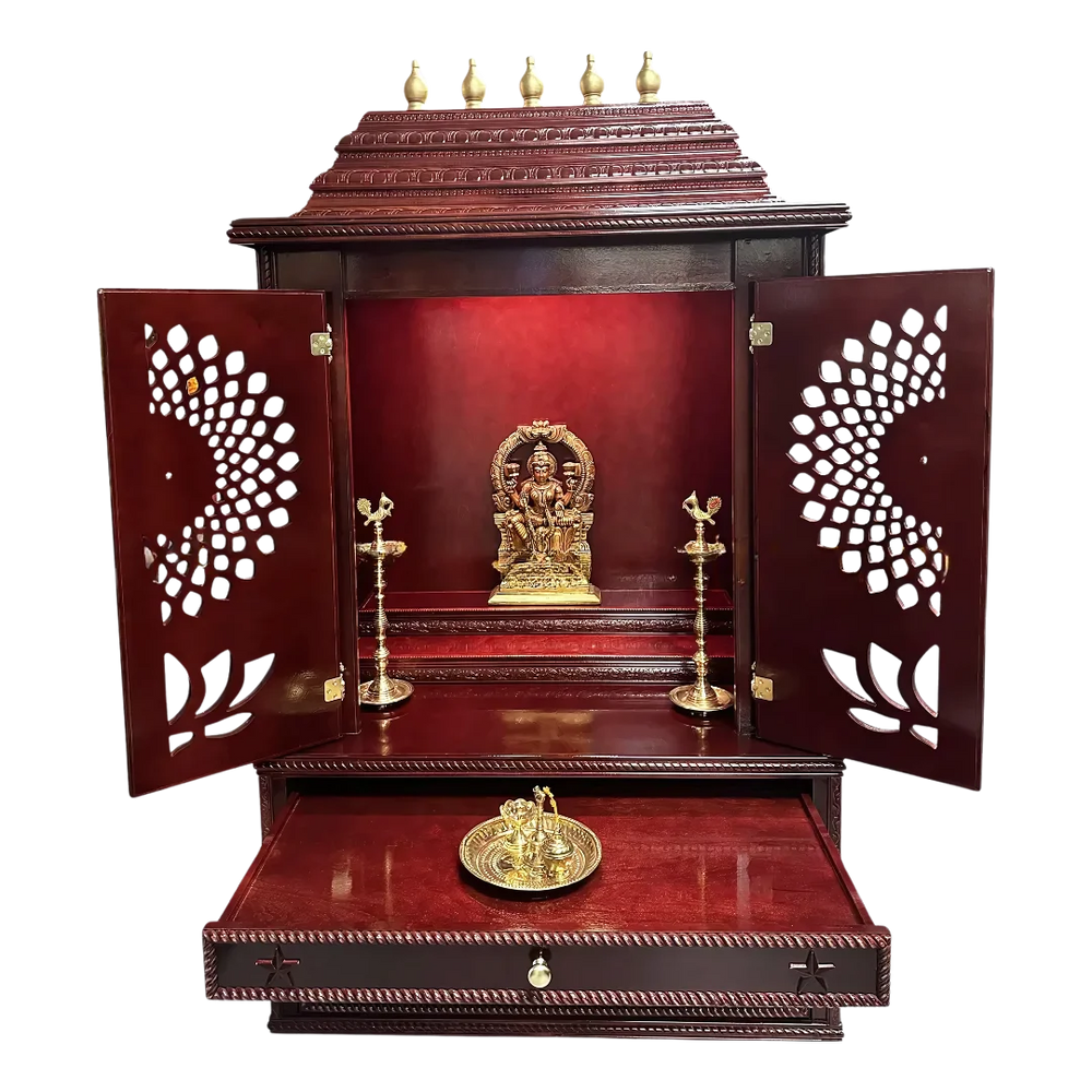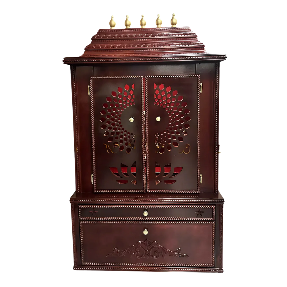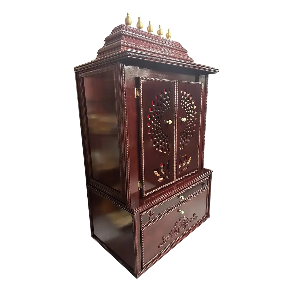 Bring divine elegance to your home with the Swarnika Teak Wood Mandap, a beautifully designed pooja manda that merges art and devotion. The front doors feature eye-catching floral cutwork that filters light and adds a decorative view even when closed. When opened, the temple exposes a high and open sanctum that has a backdrop which sets idols put inside into focus. It can be used as a large mandir in the house because of its large appearance, and its high facing looks interesting in any pooja corner. This gopuram is made in dome-style with tiered steps characteristic of the classical temple and has golden kalash details to make it look lavish. The lower storage section is provided with a wide drawer having rope patterns in border style and carved floral patterns also incorporated into the overall style. It is well balanced and clearly the layout makes each side clean and symmetrical. The teakwood pooja mandap with its mahogany finish, rich color and elaborate design, will serve as both a practical and an aesthetic feature in your home. A perfect piece for those who seek beauty, durability, and tradition in one design.