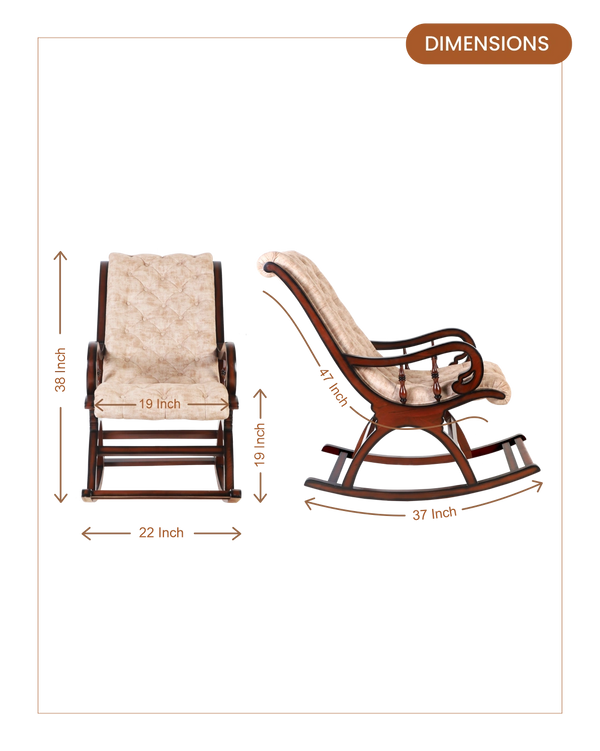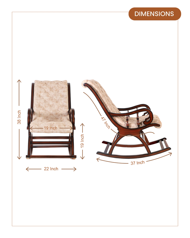 Fabric Upholstered Aaram Chair with Footrest- These fixed resting chairs are the ultimate comfort rocking chairs you can find! The rocking chair is a true representation of modern comfort. The rocking chairs are not only armed with cushioning and top-class fabric upholstery, but they come with a footrest. The design of these 2-part chairs is seamless and looks like a single unit. You can look forward each day to relaxing your entire body. Brown mahogany color of rocking chair complements modern interiors with classic vibes. A living space stays incomplete without this rocking chair. Brown mahogany color complements modern interiors with classic vibes. The footrest has the same satin matte finish and snug cushioning for your feet, paired with the gentle curve of the backrest to experience comfort after a busy day.