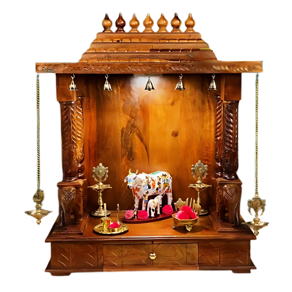 Suspended from both top and sides, the mandir includes a series of bells connected with golden chains. When used in pooja, they make a pleasant chime that increases the feeling of devotion. From every direction, these bells add beauty to the sanctum. This specific arrangement is a sign of good fortune when applied to temple layout. The chain effect gives depth to this teak color theme. Their gentle chimes help to make a peaceful environment for prayer. The chains are firmly fixed to offer durability. This ensemble completes the aesthetic of a traditional teak wood mandir.