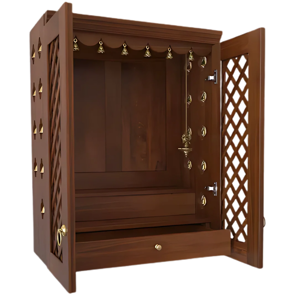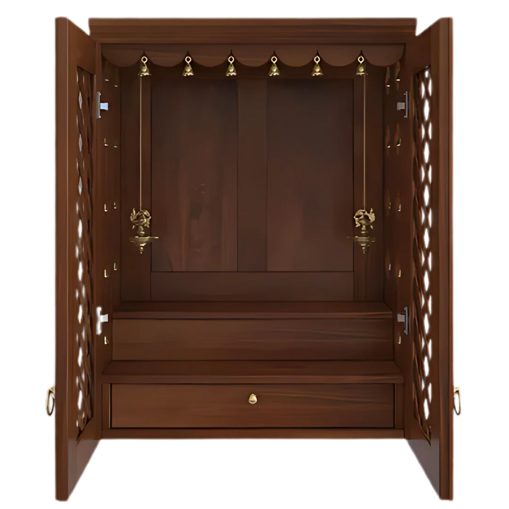 The Vedic Sthana Wall Mount Pooja Mandir is crafted from premium teak wood, presenting a refined and sacred design suited for homes that value both devotion and elegance. This wall temple brings spiritual presence to your interiors with its neatly patterned wooden doorwork, featuring criss-cross lattice details and rich teak finish. The five balanced dome finials at the top give this wall hanging mandir a classic temple form without excess embellishment. The compact profile allows it to be mounted on any wall, making it ideal for apartments or smaller pooja corners. This wall mount pooja mandir has one drawer at the bottom with a golden knob. It is useful for keeping pooja items and does not spoil the holy look of the temple. This mandir looks good in both traditional and modern homes. It is a good mix of use simple design and spiritual feel.