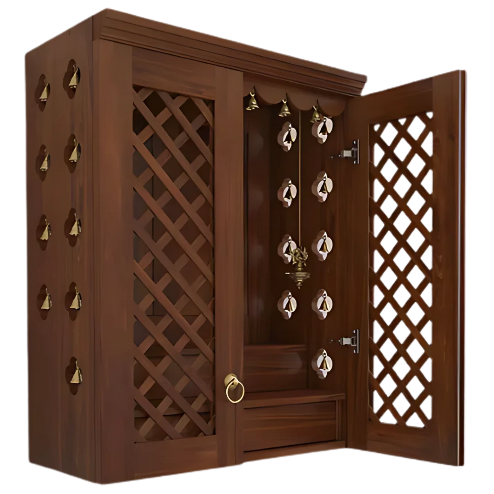 This home temple features hanging brass diyas inside, adding sacred value. The lattice doors allow indirect light and shadow play, creating a calming effect. From the carved scalloped edges to the tiny bell hangings, each part is made to support a divine setting in your home.