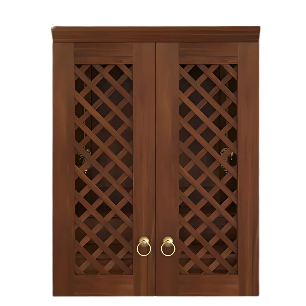 The artistry of the Vedic Sthana wall mounted mandir speaks for itself. The mandir design comes with a beautifully patterned jali door in lattice style and soft curves that add depth. The warm teakwood finish gives the wall temple a rich tone. This elegant design adds timeless character to your sacred corner.