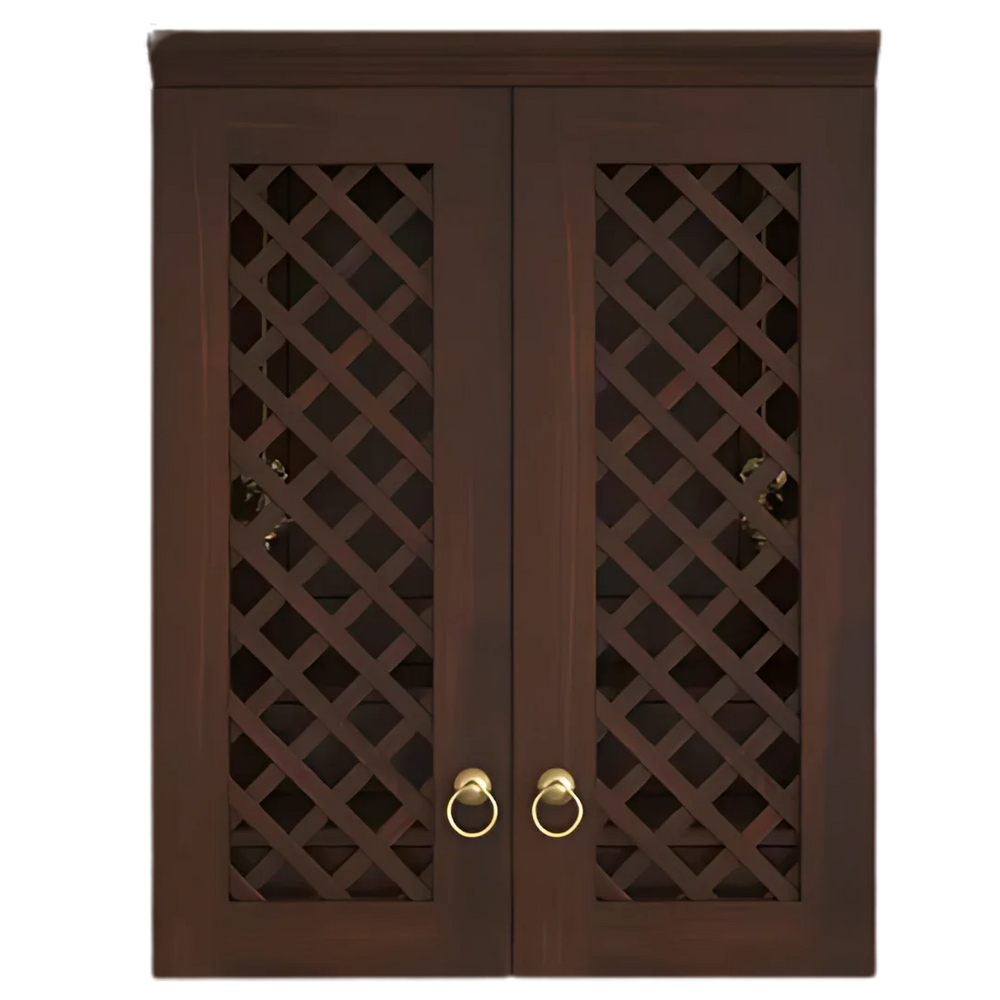 The Vedic Sthana Wall Mount Pooja Mandir is crafted from premium teak wood, presenting a refined and sacred design suited for homes that value both devotion and elegance. This wall temple brings spiritual presence to your interiors with its neatly patterned wooden doorwork, featuring criss-cross lattice details and rich wenge finish. The five balanced dome finials at the top give this wall hanging mandir a classic temple form without excess embellishment. The compact profile allows it to be mounted on any wall, making it ideal for apartments or smaller pooja corners. This wall mount pooja mandir has one drawer at the bottom with a golden knob. It is useful for keeping pooja items and does not spoil the holy look of the temple. This mandir looks good in both traditional and modern homes. It is a good mix of use simple design and spiritual feel.