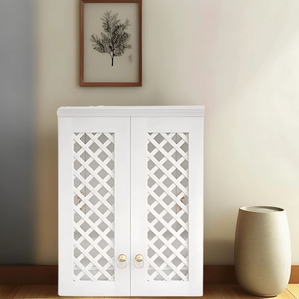 The Vedic Sthana Wall Mount Pooja Mandir is crafted from premium teak wood, presenting a refined and sacred design suited for homes that value both devotion and elegance. This wall temple brings spiritual presence to your interiors with its neatly patterned wooden doorwork, featuring criss-cross lattice details and rich white finish. The five balanced dome finials at the top give this wall hanging mandir a classic temple form without excess embellishment. The compact profile allows it to be mounted on any wall, making it ideal for apartments or smaller pooja corners. This wall mount pooja mandir has one drawer at the bottom with a golden knob. It is useful for keeping pooja items and does not spoil the holy look of the temple. This mandir looks good in both traditional and modern homes. It is a good mix of use simple design and spiritual feel.