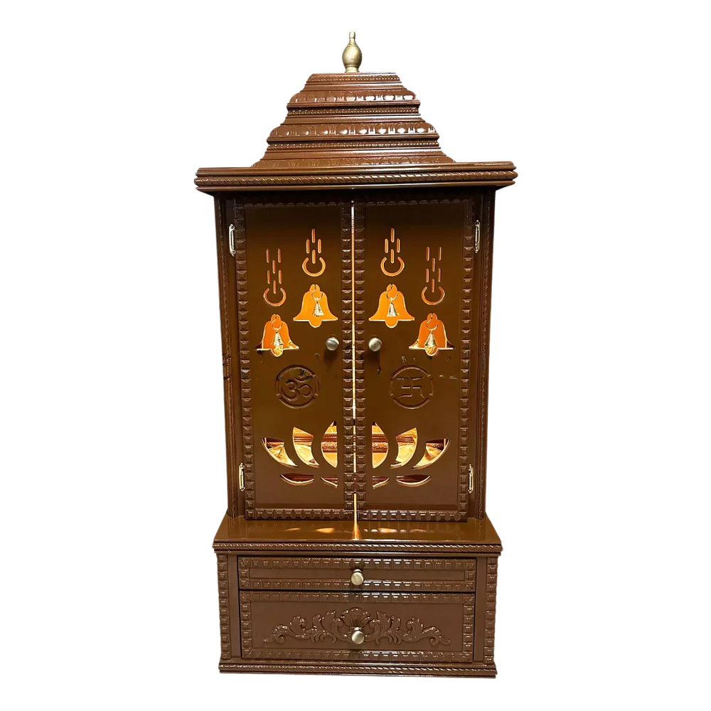 The Vedmangal Teak Wood Mandap in caramel brown color is a beautiful example of devotional architecture, thoughtfully crafted for modern Indian homes. This pooja mandap has a compact vertical form with a step-style dome that provides the traditional temple-like form without taking too much space. The two doors are carved with complex Om, lotus and bell and their representations are cleanly framed. The carved designs are formation of a divine visual impression, and it is suitable to give spiritual ambience to your place. The interior provides an elevated platform that helps organize idols and pooja items neatly. Below, there is a concealed storage with a smooth sliding tray and a roomy drawer that complements daily rituals with ease. The caramel brown color of the body accentuates all the details of the design and becomes a neutral background, which will make brass or wooden accessories inside more visible. Be it a festival or a daily pooja, this large home mandir strikes a fine balance between form and functionality. It is a durable design in teakwood pooja mandap. The caramel brown color reinforces serenity and harmony, making it a perfect centerpiece for your sacred zone.