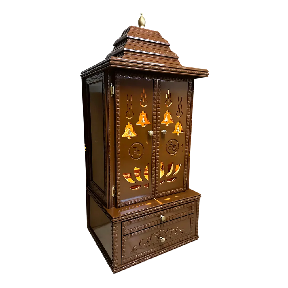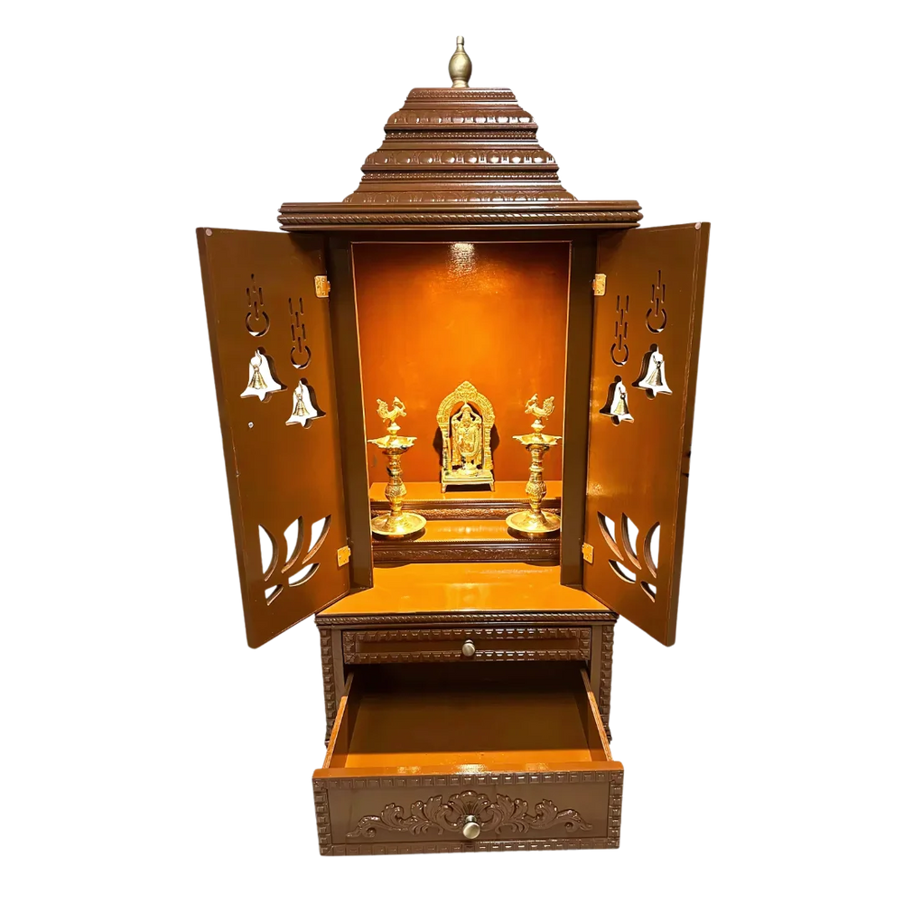 Every part of this mandap, from the top dome to the bottom drawer, has carved borders. The patterns are neat and placed in a proper way, so they look nice without being too much. These borders are also added on the drawer front, door edges, and side panels to give a complete and balanced look from all sides. The caramel brown color shows each carved line clearly and adds a soft, clean look. These details make the mandap stand out in any pooja space. It gives both beauty and use while keeping the feel of traditional Indian design.