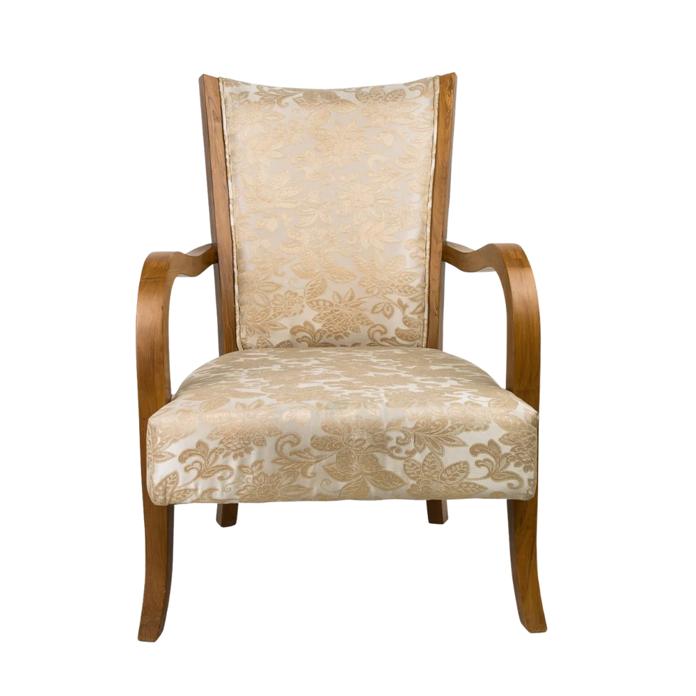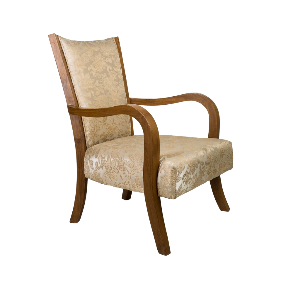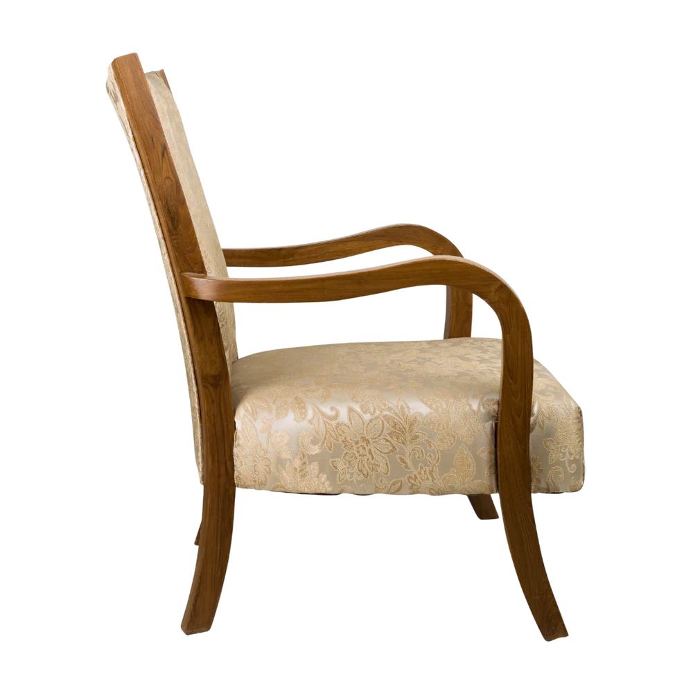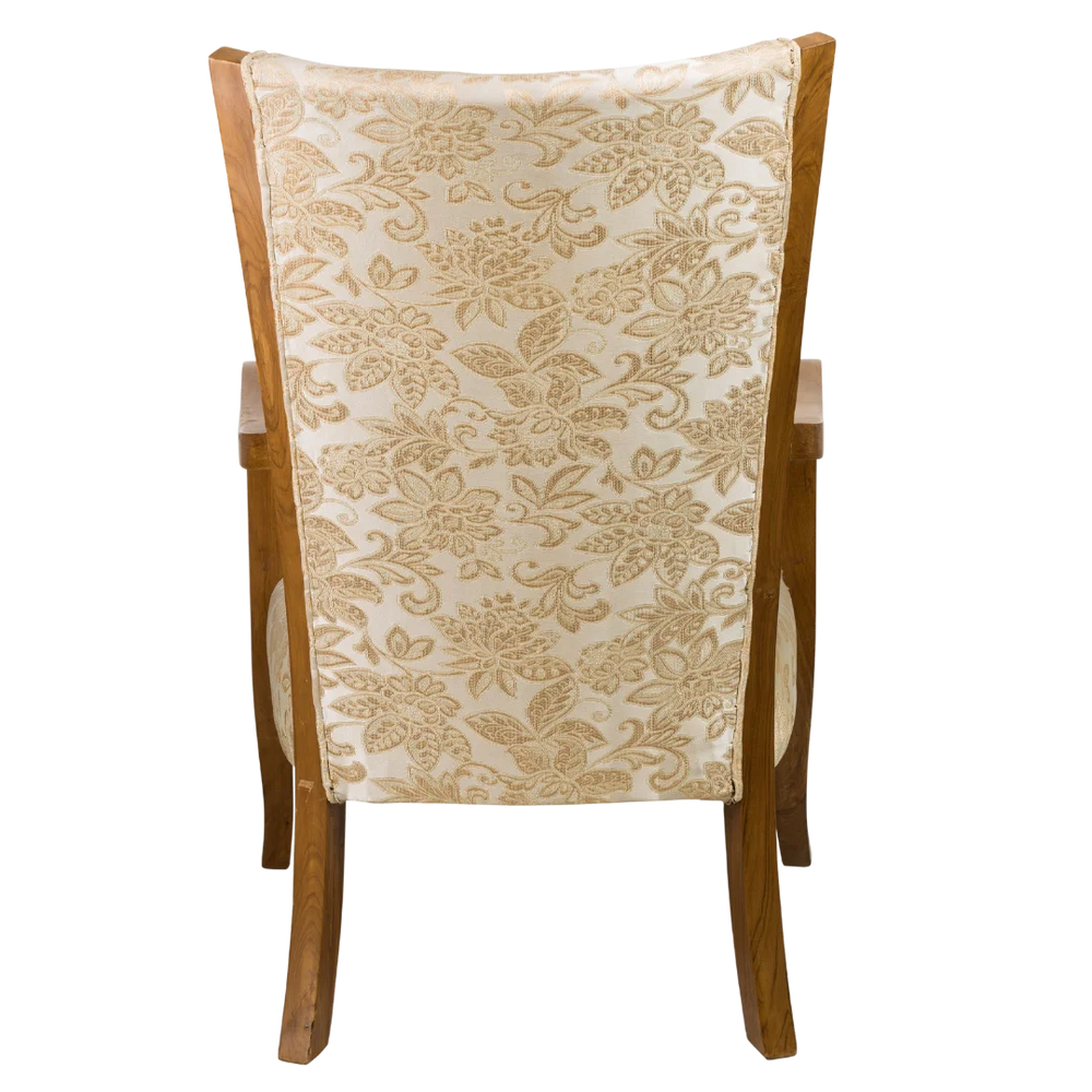 The Velencia Teak Wood Arm Chair has a simple shape with smooth lines and a classic style. The cream fabric with golden flower designs covers the seat and backrest which gives it a soft and royal look. The natural color of the teak wood frame makes the chair look even better and gives a nice balance between the wood and the fabric. The smoothly curved arms join the backrest naturally, giving the chair a well-finished look from every side. Its elegant design stands out in both vintage and contemporary interiors.
