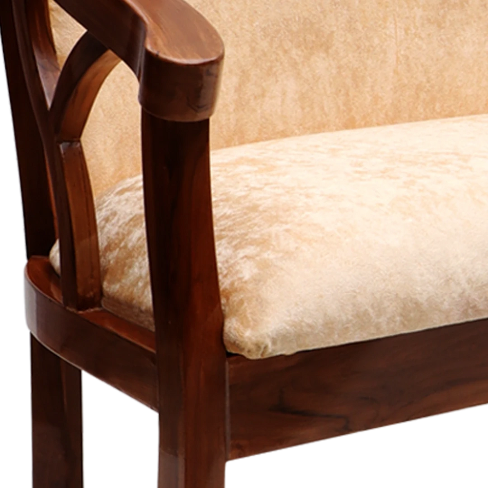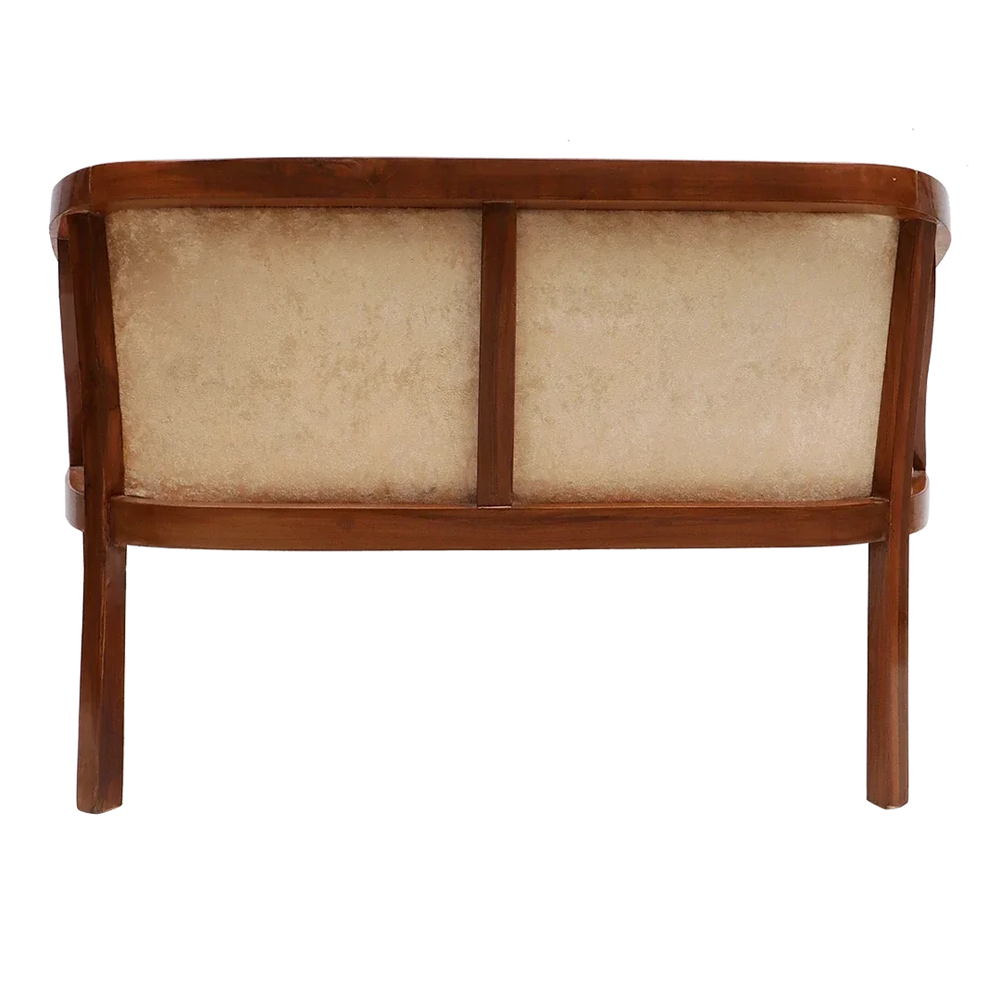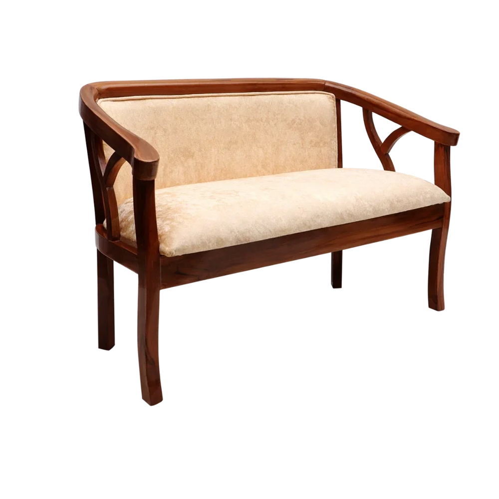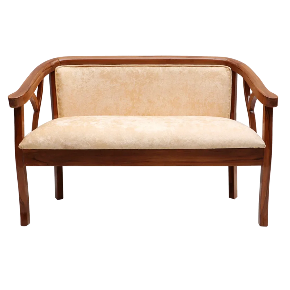 The Verior Solid Wood Love Sofa is a stylish and comfortable piece for any room. This handmade love seat has a soft curved backrest and carved side design that adds both beauty and use. The seat is covered in soft beige fabric which feels relaxing and adds charm to the space. The teak color wood frame gives a warm and rich look that makes the 2 seater wooden chair stand out. The slim, inward curved armrests and cushioned seat give good support without losing style. You can place this love sofa in a bedroom, hallway, or small lounge and it will match any kind of room easily. The design is useful and also looks artistic which makes it perfect for both simple and formal settings. The natural wood grains in the teak color are clearly seen which gives the chair a raw and elegant feel. If you want a love seat that fits well in both modern and traditional rooms, this one offers both beauty and strength.