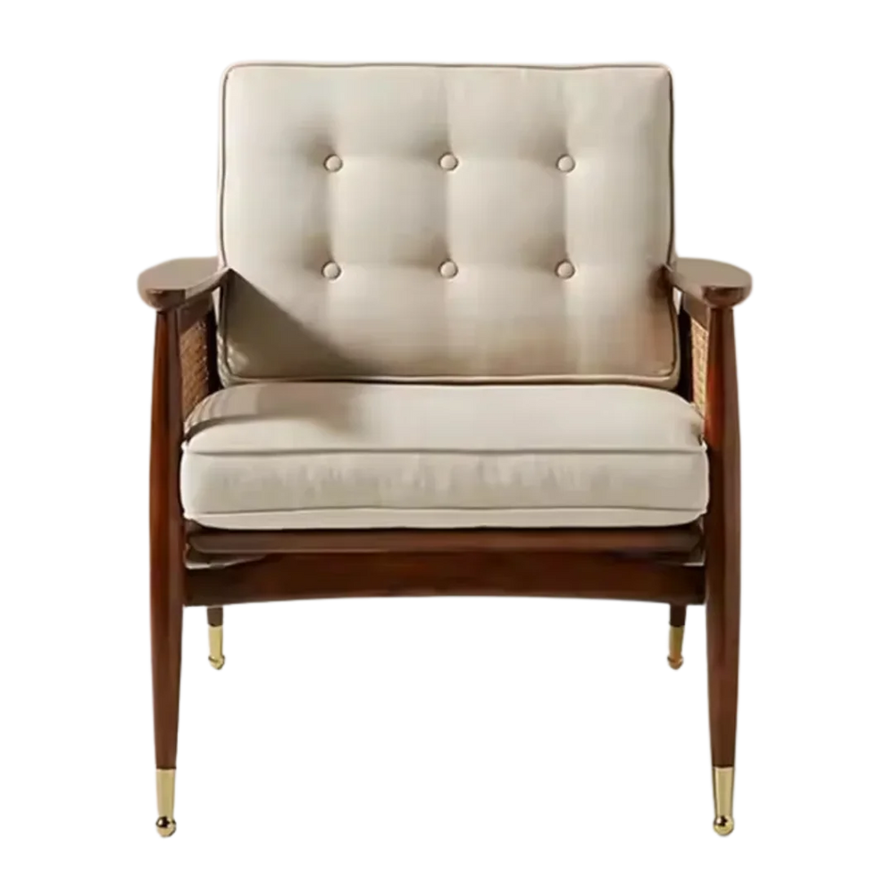 The Vintori Teak Wood Lounge Chair brings together fine handwork and lasting comfort. Made with strong teakwood, this lounge chair has natural cane weaving on the sides and back, which gives it a fresh and vintage look. The soft cream cushions with button designs offer both comfort and firm support for long sitting. The smooth teak frame, the angled backrest and the wide armrests give great comfort while keeping the chair light and strong. Golden caps on the tapered legs add a soft, rich touch. With beautiful wood lines and a design inspired by old styles, this cane lounge chair fits well in living rooms, reading spaces and lounges, giving a cozy place for everyday use. Every part of the chair shows a perfect mix of fine handwork and modern comfort. It is made to last for years while keeping its beauty and comfort with very little care.