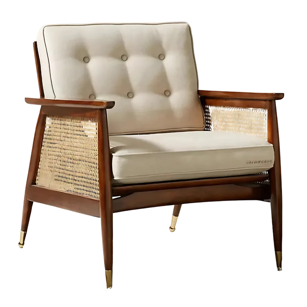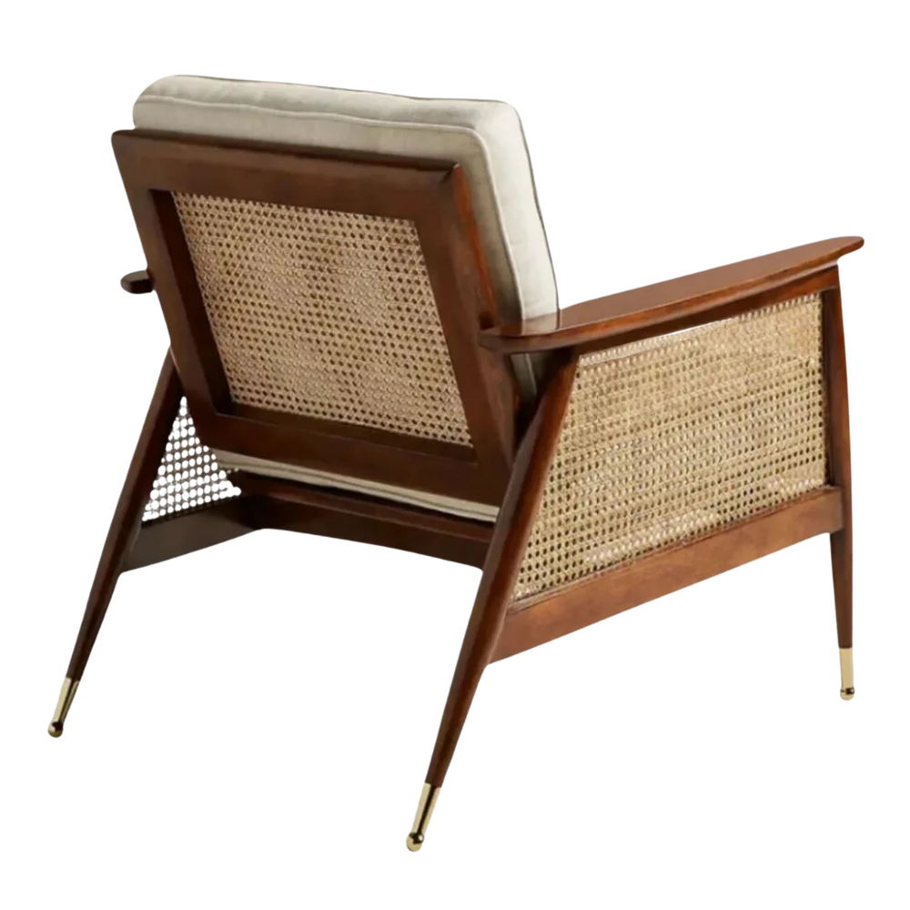 The sides and back panels of the this cane lounge chair are made with carefully handwoven natural cane. This cane adds both strength and a light, open look to the chair. The cane design allows air to pass easily and keeps the chair feeling fresh. The fine handwork shows traditional skill and matches well with the modern frame, giving a good mix of use and style. The cane is finished neatly to stay firm and not sag over time. Its natural look softens the wooden frame and adds a simple, earthy touch. It makes the cane chair feel open while still giving privacy to the person sitting. The natural cane also brings a warm and welcoming feel to any room.