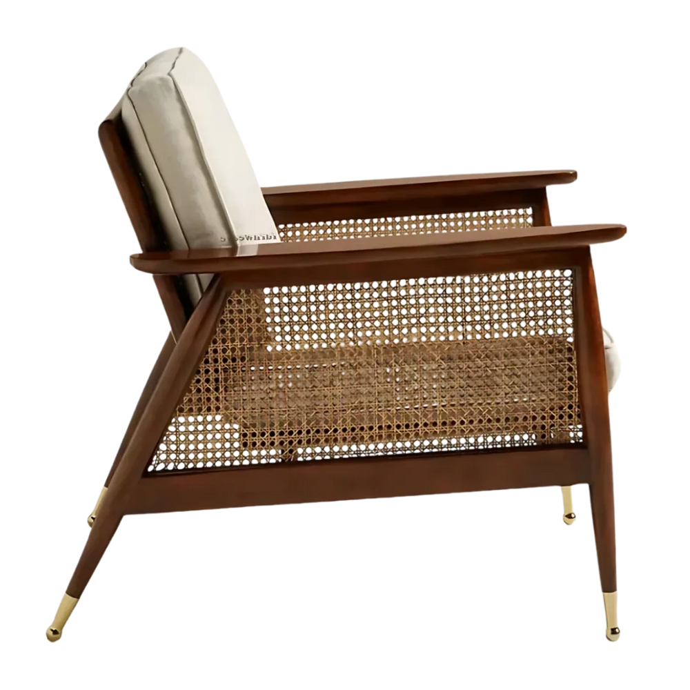 The lounge chair stands firm on strong teak wood legs that are shaped neatly and finished with stylish golden metal caps. These metal caps not only make the chair look better but also protect the wood from daily use and marks. The strong legs give the chair good balance and a smart, tall look. The slightly wide shape of the legs makes the cane chair look light and airy. The mix of teak wood and gold color adds a soft, rich touch to any room. It gives the lounge chair for living room a steady yet stylish look that will stay beautiful for many years.