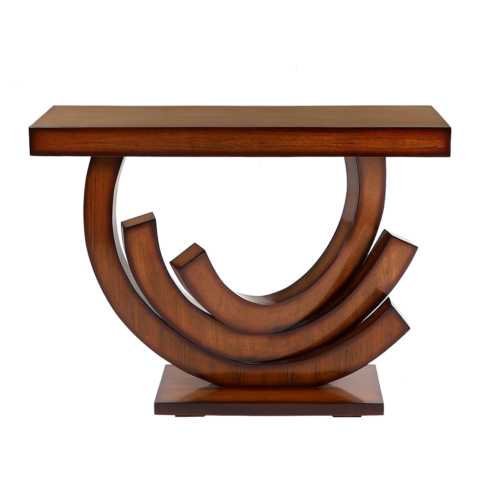 The unique craftsmanship and attractiveness of the Warc console table make it stand out. Its uniquely curved base is not only practical but also a bold expression of style and imagination that makes it a centerpiece of any home. The unique design of the table is enhanced by the natural teak finish, which gives it a warm and elegant look. This wooden console table can match with any type of home décor whether it is modern or traditional. This table is more than a piece of furniture, it is a masterpiece that combines beauty and utility for your living space. Its style enhances your interior's charm and attracts attention.