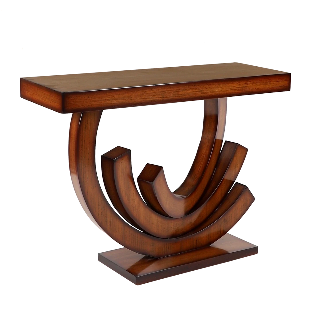 The Warc Console Table comes with a smooth and glossy finish that improves the overall look of this table. The finish makes it easier to clean the table. This glossy coating gives the table an elegant appearance setting it apart as a focal point in any room. The tabletop is simple to wipe down resistant to dust and safeguards against spills allowing you to maintain its pristine condition with minimal effort. Additionally, the lustrous finish provides a shield for the wood, against scratches and minor wear and tear. This low-maintenance feature makes the Warc console table a practical option ensuring it stays, both visually appealing and functional in your home. The finish adds a touch of luxury to your space.