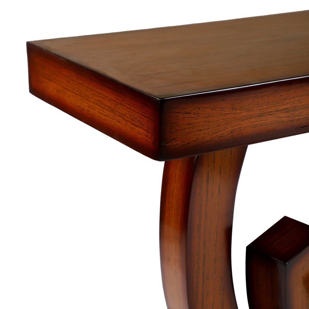 This console table showcases craftsmanship. The teak wood and high-gloss finish are impressive, and the table is very sturdy. It’s a great piece for my home.