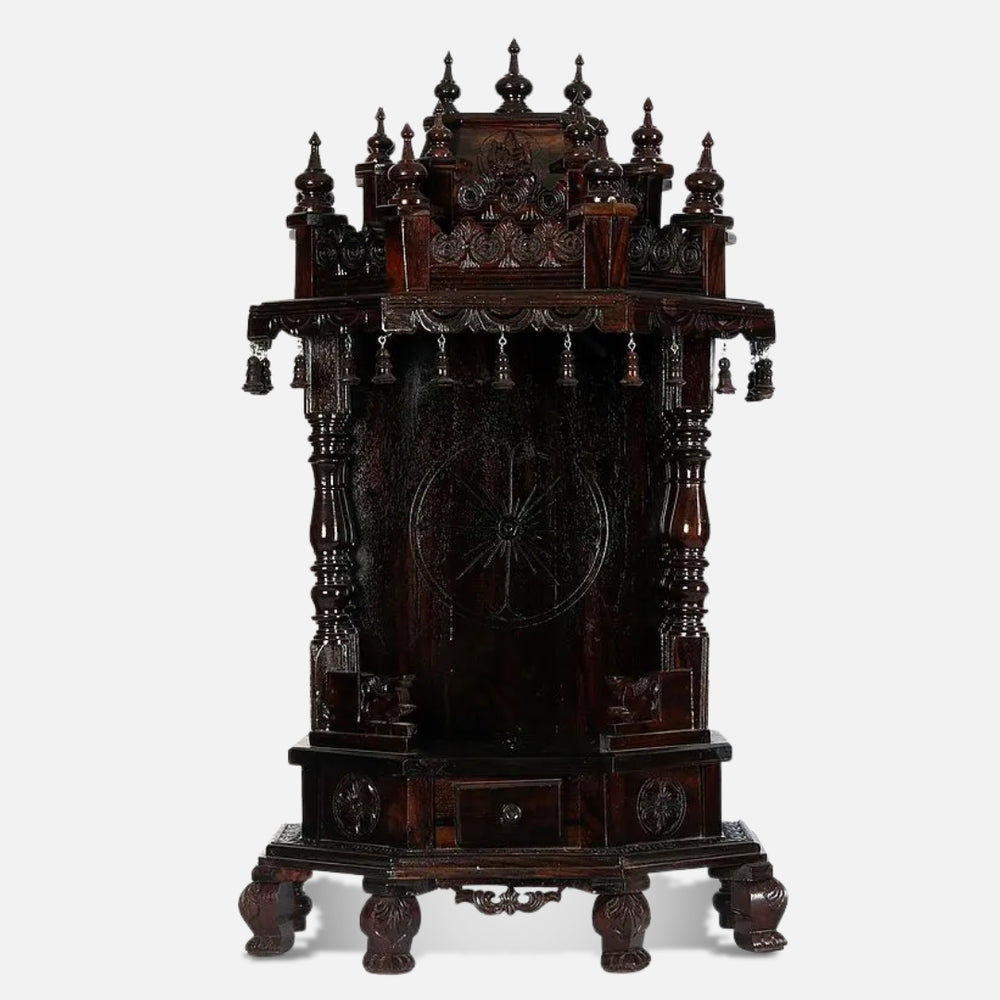 The Yugadharma Wooden Temple in wenge color shows a blend of fine craftsmanship and traditional design. It has a beautifully carved dome with many small shikhars that give it the look of an old Indian temple. The dark wenge color adds a royal and rich feel to the mandir, making it stand out in your pooja space. The design is made to hold idols neatly and adds a calm and sacred look to your home. The carvings and smooth polish show detailed handwork and devotion. The strong wooden structure gives it long life and makes it both useful and beautiful. The decorative designs on the body add charm and make it a fine piece for worship and display. Each carved line shows skill and care, turning the space into a peaceful corner for prayer. This wooden temple is a mix of strength, art, and tradition that adds grace and devotion to any home.