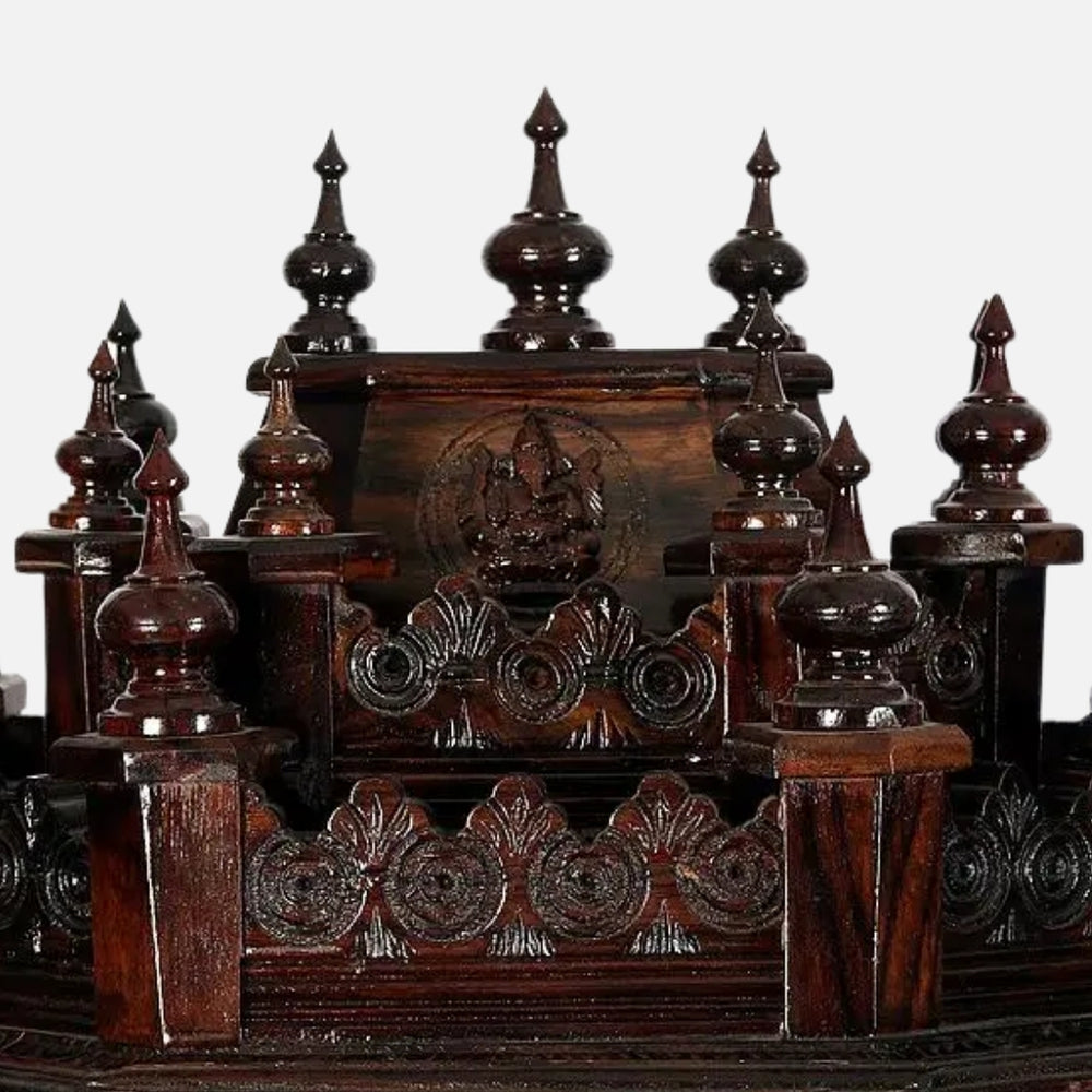 The carvings on the dome of this mandir are deeply defined and based on the form of spires in temples. The neat and deep engravings on each part of the dome are beautiful in the dark wenge color polish. The full design has smooth curves and lines which bring depth and provide a constant rhythm. The carvings are done very carefully and reflect the art of traditional craftsmen. Every small detail adds to the beauty and strength of the temple. The rich design on the dome gives the mandir a graceful and divine look. The balanced and complete form of the design is ensured by the even forms along every side and makes the top part of the temple look very prominent as an image of piety and good art.