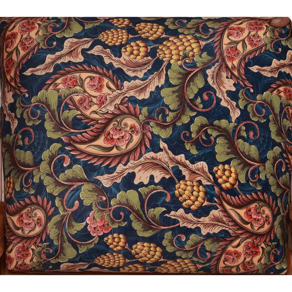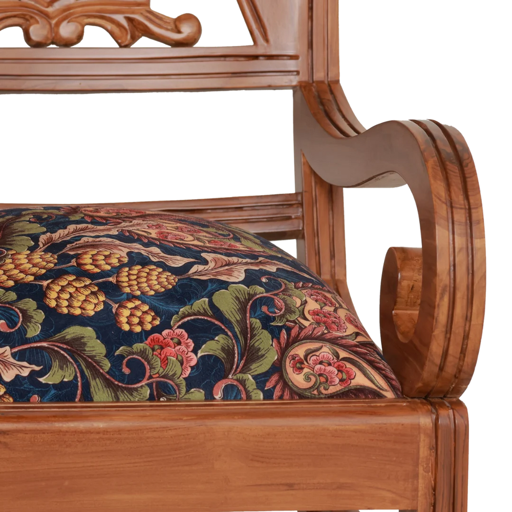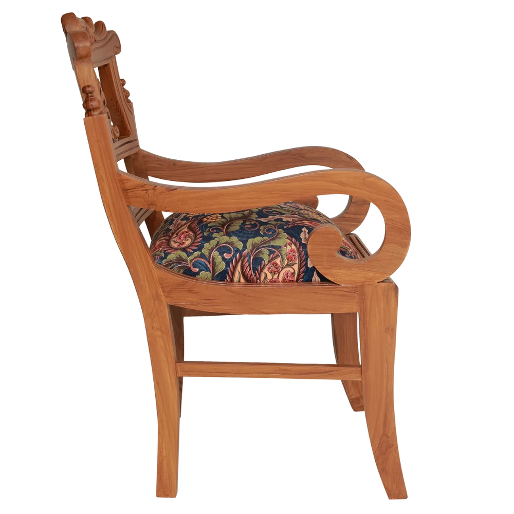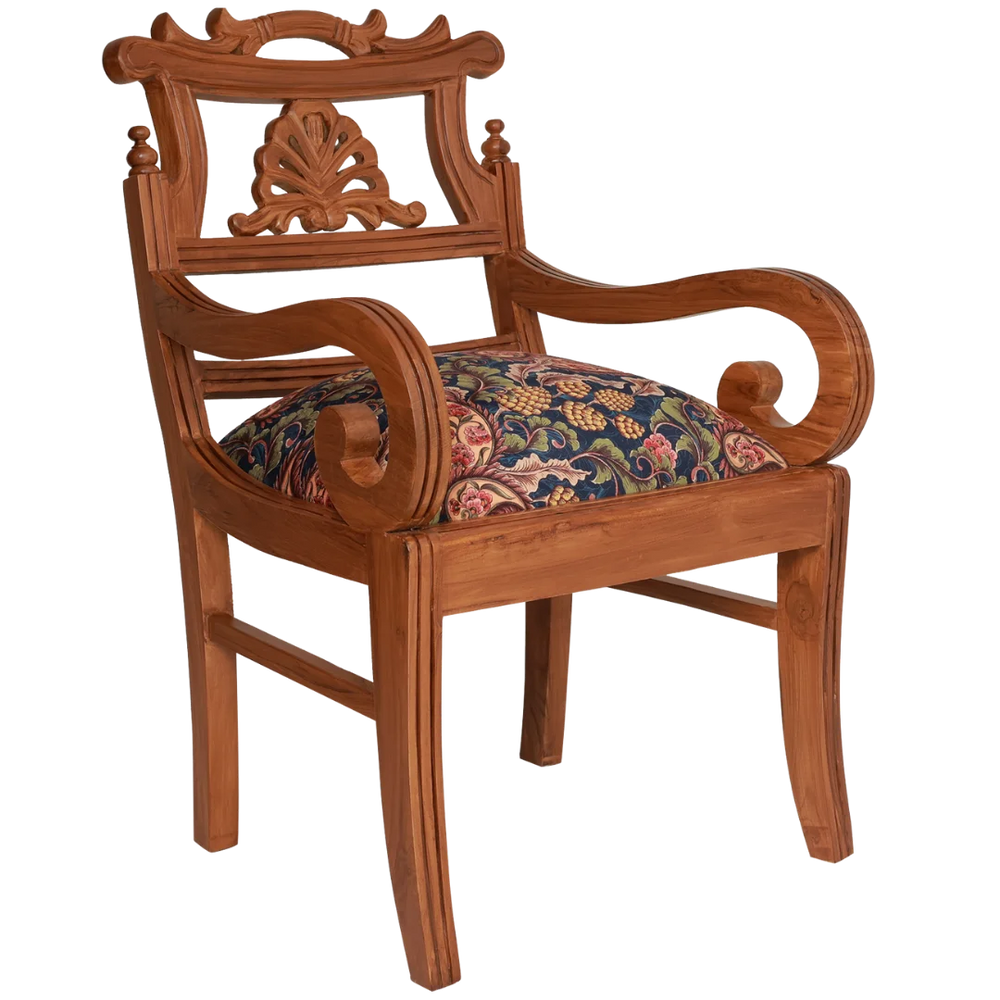 The vibrant, natural and natural teak colour of the wooden chair with armrest is a classic example of vintage-style furniture. The wood of the legs, armrests and backrest is outlined by a black colour that matches flawlessly with the teak shade. The little golden colour touch to the wooden floral motifs and dome-shaped scroll finial gives the bedroom chair a luxurious appearance. The floral pattern of the blue colour of the fabric has its own natural meaning. The striking bright red colour shows the boldness and enhances the beauty of the fabric. The little golden leaves are the image of royalty.