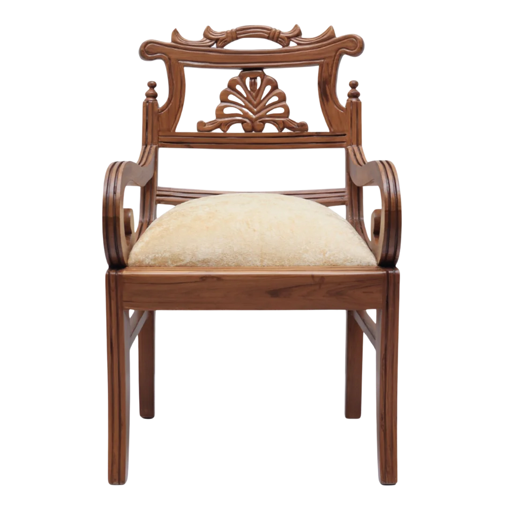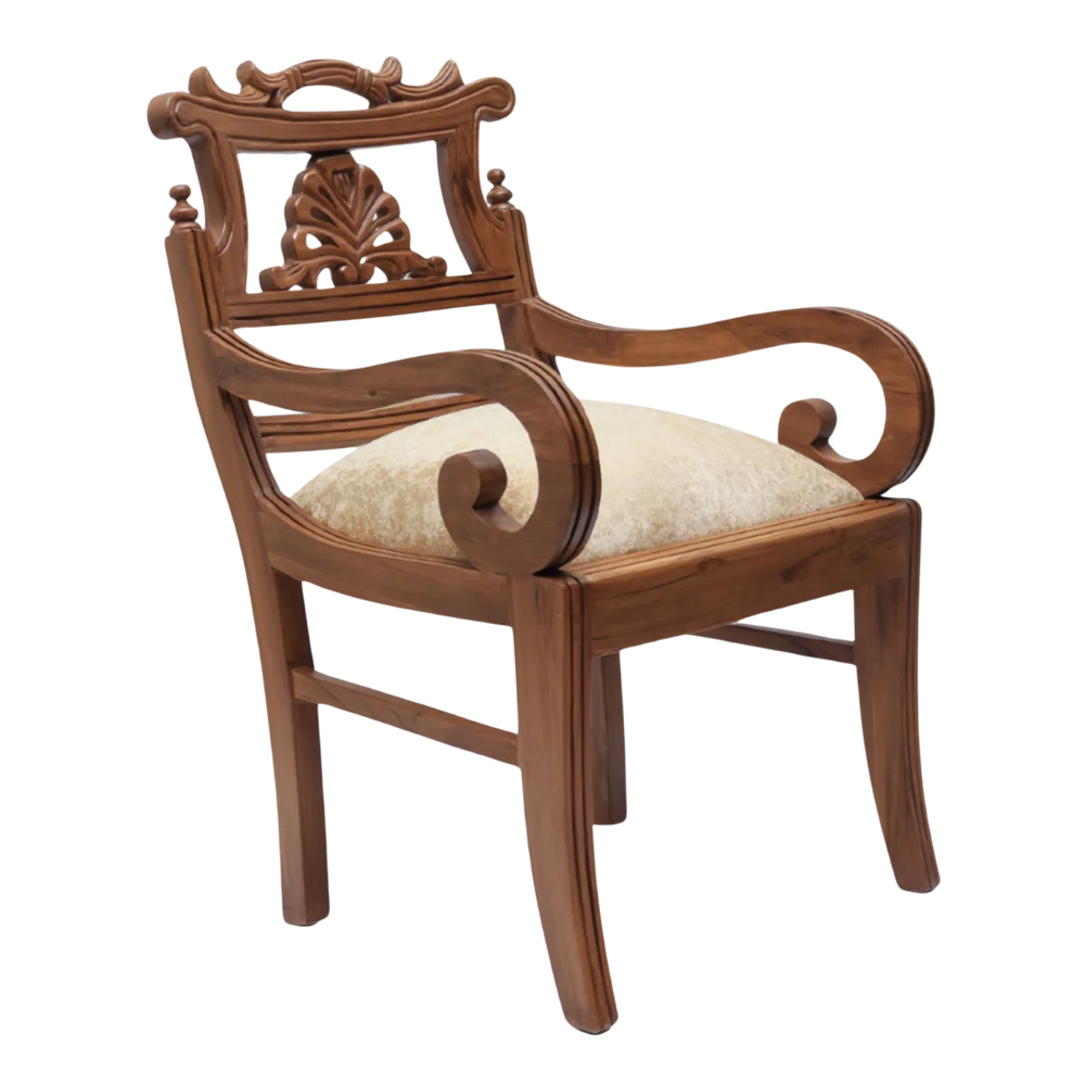 This beautiful wooden chair with armrests is known for its great style and strong design. It is one of our best furniture pieces because of its special carvings and classic look. You can enjoy sitting on this cushioned furniture item because it provides wonderful comfort. The chair's fabric has a delicate pattern that enhances its luxurious clean presentation. The chair uses durable teakwood as its main material for maximum strength and extended longevity. The notable beauty of this chair stems from its design features on the backrest as well as its curved arms. The scroll-shaped arms give a nice flowing look and the well-shaped legs add to its traditional style. The golden fabric matches well with the natural teak wood and gives a warm and welcoming feel. Every curve and design shows both strength and beauty which makes this chair a perfect piece for any room.