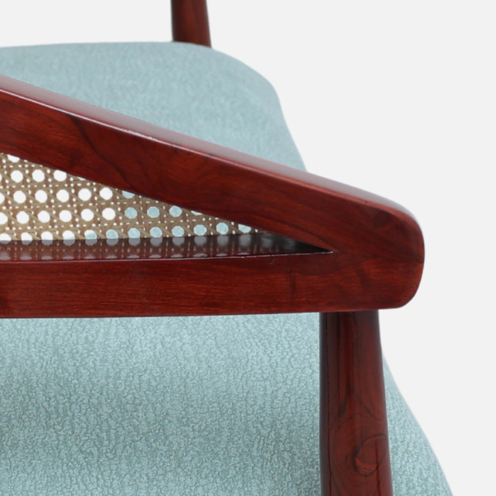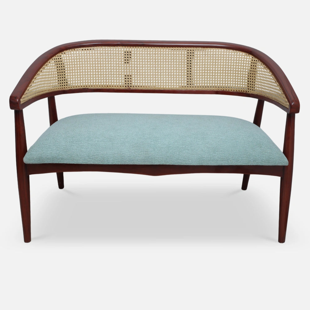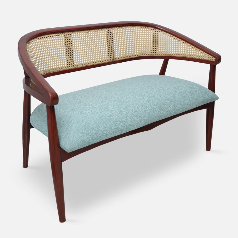 The Zylen Solid Wood Love Sofa is a modern two-seater that combines comfort and elegance in one design. It has a strong teakwood frame with smooth curves that give it a stylish and graceful look. The cane backrest provides a light and airy feel and also offers a firm support. The seat is fabricated with smooth fabric of cool blue color which goes well with the brown color of wood. The cushion is thick enough to sit on for a very long time and to relax or chat. The grains of the wood are well visible in the brown polish which gives a rich and shiny look. The design saves space but still gives wide seating for two people. This wooden sofa is a combination of modern style and traditional cane art, which gives it a balanced appearance that suits any room. It may be positioned next to a coffee table, next to a window, or in one corner of a bedroom. The Zylen love sofa is not only warm, comfy and elegant, but also remains strong over the years.