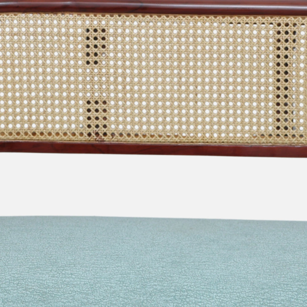 This cane sofa has the backrest which is done with fine handwoven cane, which provides it with a light and natural appearance. The open pattern enables air to go through which maintains the seat cool and comfortable. The teakwood frame is strong and it keeps the cane tight and durable over the years. The cane color is warm and blends with the brown polish on the wood as well as on the design itself. The clean weaving gives strength and a smooth surface to lean on. The backrest has a slight curve that fits the body well and makes sitting more relaxing. The handmade cane work shows traditional skill in a modern style. The natural texture of the cane adds beauty and freshness to this wooden love seat.